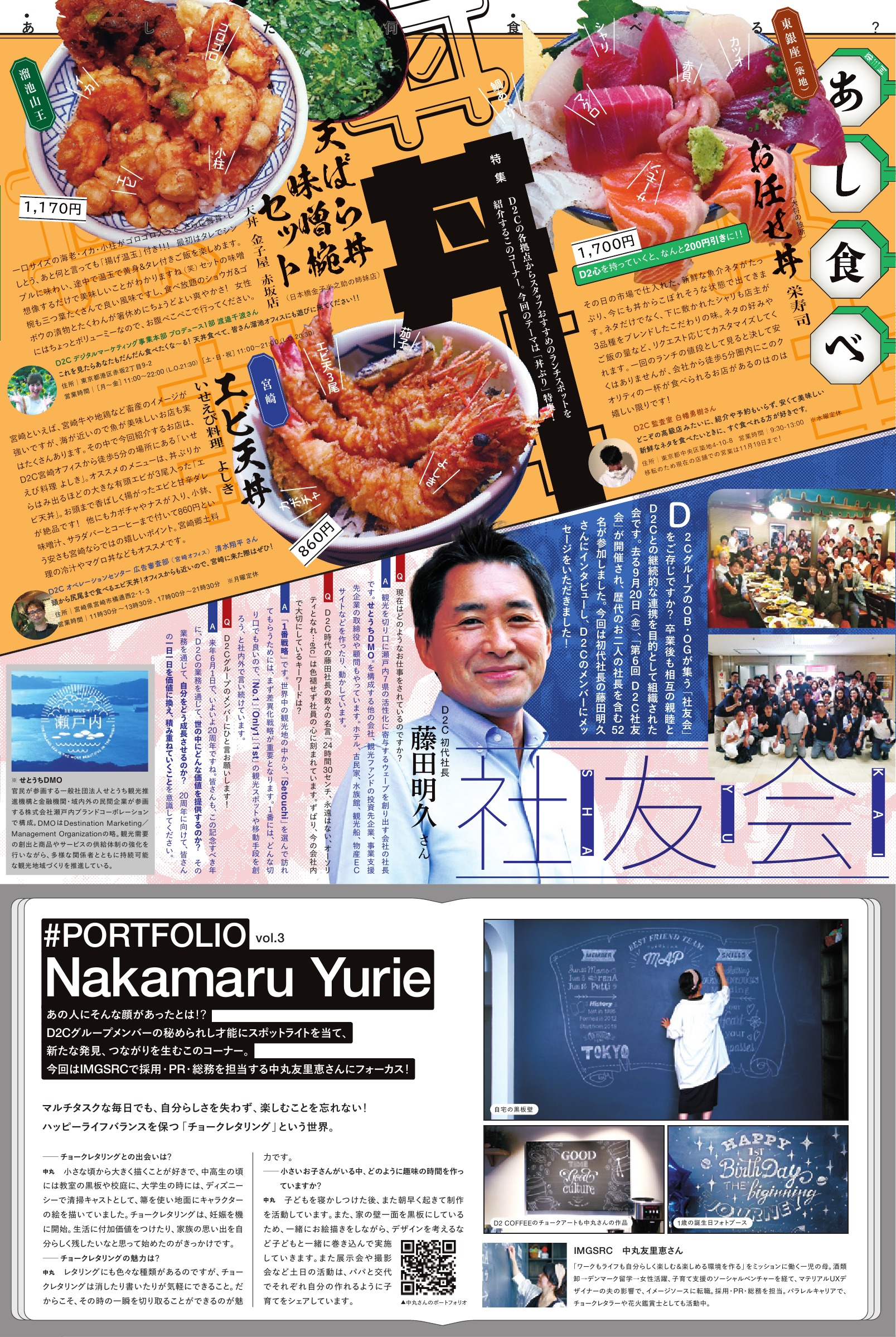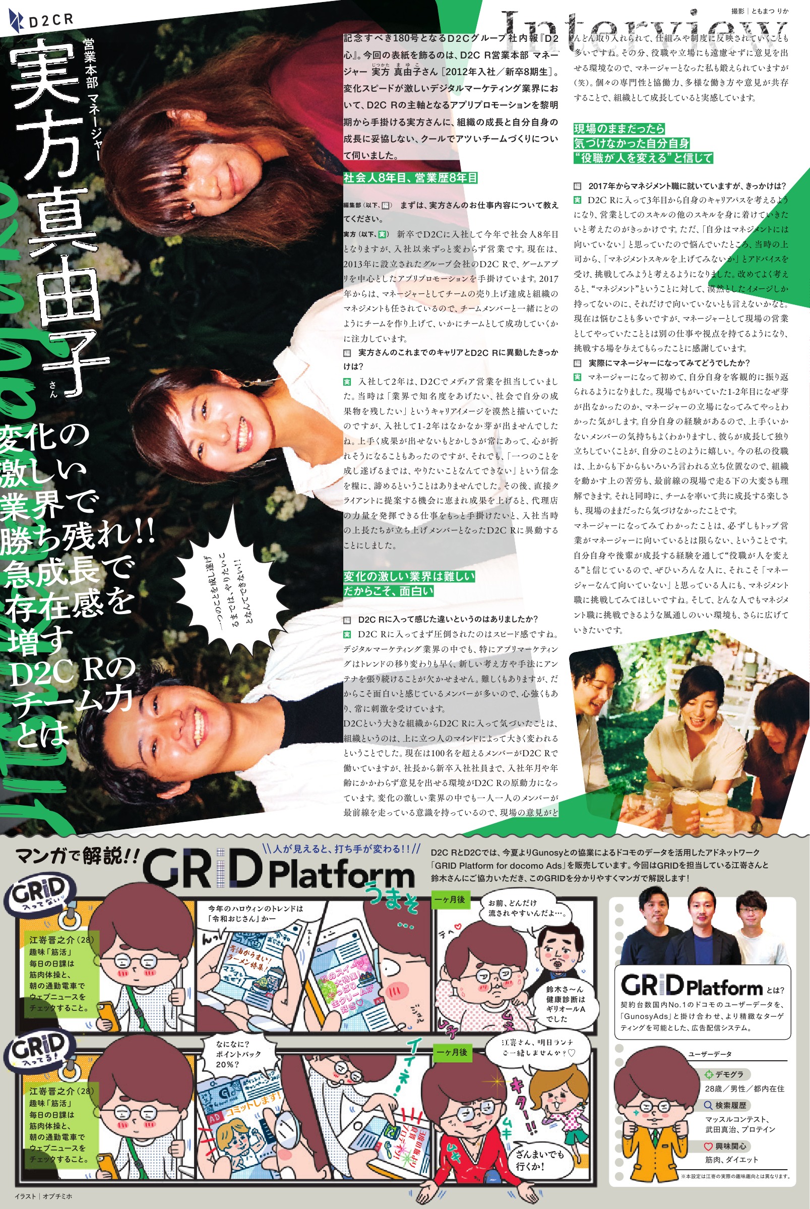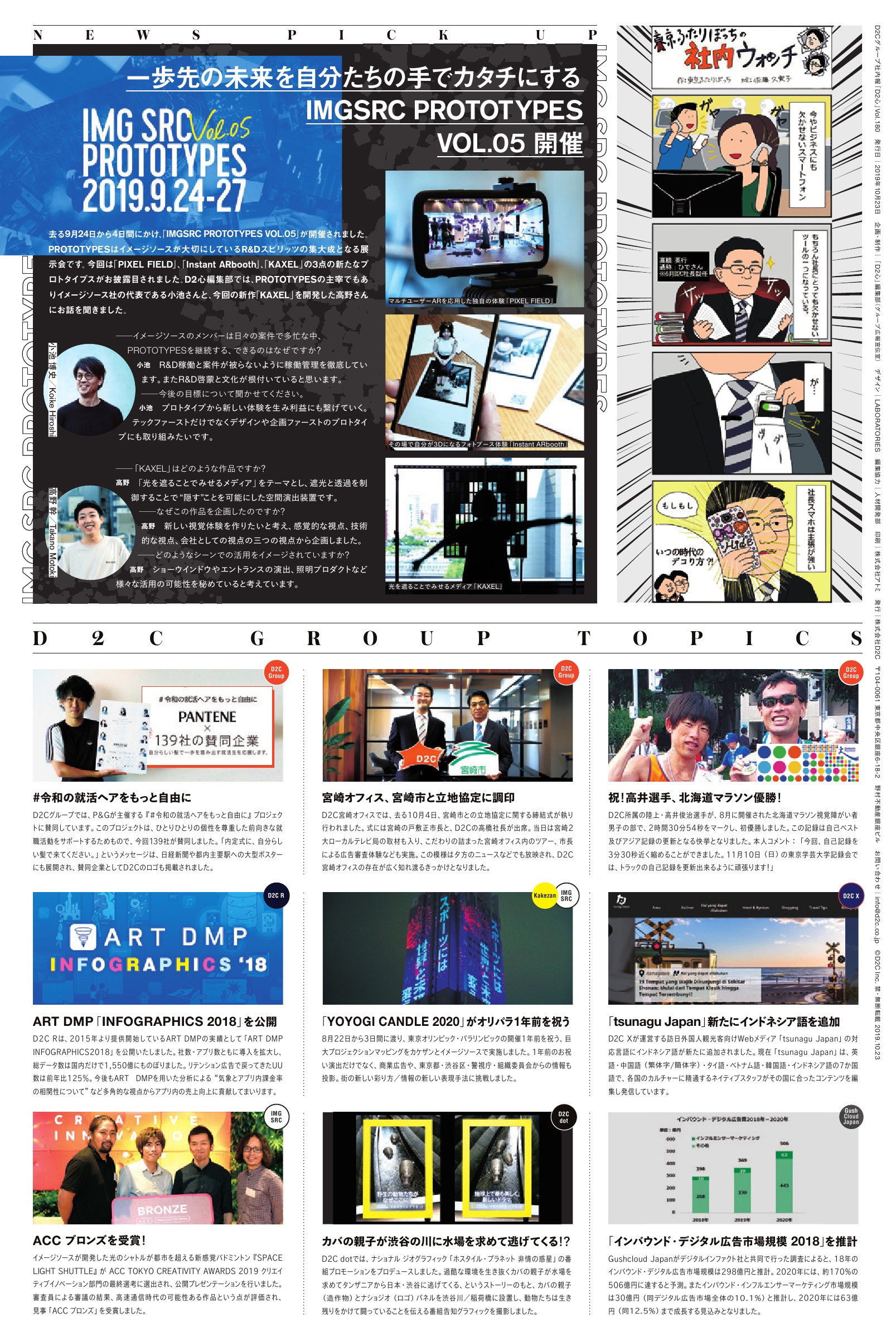 vol.180 2019 AUTUMN 2019.10.23 発行 巻頭特集:D2C R 実方 真由子 D2C初代社長 ・ 藤田明久氏登場 !!社友会 [#PORTFOLIO]中丸友里恵 マンガで解説 GRID Platform [あした何食べる?]東銀座(築地)、 溜池山王、宮崎 [四コマ漫画]東京ふたりぼっちの社内ウォッチ PDFで開く D2C GROUP TOPICS #令和の就活ヘアをもっと自由に  ̄ ̄ ̄ ̄ ̄ ̄ ̄ ̄ ̄ ̄ ̄ ̄ ̄ ̄ ̄ ̄ ̄ ̄ ̄ D2Cグループでは、P&Gが主催する『#令和の就活ヘアをもっと自由に』プロジェクトに賛同しています。このプロジェクトは、ひとりひとりの個性を尊重した前向きな就職活動をサポートするためもので、今回139社が賛同しました。「内定式に、自分らしい髪で来てください。」というメッセージは、日経新聞や都内主要駅への大型ポスターにも展開され、賛同企業としてD2Cのロゴも掲載されました。 宮崎オフィス、宮崎市と立地協定に調印  ̄ ̄ ̄ ̄ ̄ ̄ ̄ ̄ ̄ ̄ ̄ ̄ ̄ ̄ ̄ ̄ ̄ ̄ ̄ D2C宮崎オフィスでは、去る10月4日、宮崎市との立地協定に関する締結式が執り行われました。式には宮崎の戸敷正市長と、D2Cの高橋社長が出席。当日は宮崎2大ローカルテレビ局の取材も入り、こだわりの詰まった宮崎オフィス内のツアー、市長による広告審査体験なども実施。この模様は夕方のニュースなどでも放映され、D2C宮崎オフィスの存在が広く知れ渡るきっかけとなりました。 祝!高井選手、北海道マラソン優勝!  ̄ ̄ ̄ ̄ ̄ ̄ ̄ ̄ ̄ ̄ ̄ ̄ ̄ ̄ ̄ ̄ ̄ ̄ ̄ D2C所属の陸上・高井俊治選手が、8月に開催された北海道マラソン視覚障がい者男子の部で、2時間30分54秒をマークし、初優勝しました。この記録は自己ベスト及びアジア記録の更新となる快挙となりました。本人コメント:「今回、自己記録を3分30秒近く縮めることができました。11月10日(日)の東京学芸大学記録会では、トラックの自己記録を更新出来るように頑張ります! ART DMP「INFOGRAPHICS 2018」を公開  ̄ ̄ ̄ ̄ ̄ ̄ ̄ ̄ ̄ ̄ ̄ ̄ ̄ ̄ ̄ ̄ ̄ ̄ ̄ D2C Rは、2015年より提供開始しているART DMPの実績として「ART DMPINFOGRAPHICS2018」を公開いたしました。社数・アプリ数ともに導入を拡大し、総データ数は国内だけで1,550億にものぼりました。リテンション広告で戻ってきたUU数は前年比125%。今後もART DMPを用いた分析による“気象とアプリ内課金率の相関性について”など多角的な視点からアプリ内の売上向上に貢献してまいります。 「YOYOGI CANDLE 2020」がオリパラ1年前を祝う  ̄ ̄ ̄ ̄ ̄ ̄ ̄ ̄ ̄ ̄ ̄ ̄ ̄ ̄ ̄ ̄ ̄ ̄ ̄ 8月22日から3日間に渡り、東京オリンピック・パラリンピックの開催1年前を祝う、巨大プロジェクションマッピングをカケザンとイメージソースで実施しました。1年前のお祝い演出だけでなく、商業広告や、東京都・渋谷区・警視庁・組織委員会からの情報も投影。街の新しい彩り方/情報の新しい表現手法に挑戦しました。 「tsunagu Japan」新たにインドネシア語を追加  ̄ ̄ ̄ ̄ ̄ ̄ ̄ ̄ ̄ ̄ ̄ ̄ ̄ ̄ ̄ ̄ ̄ ̄ ̄ D2C Xが運営する訪日外国人観光客向けWebメディア「tsunagu Japan」の対応言語にインドネシア語が新たに追加されました。現在「tsunagu Japan」は、英語・中国語(繁体字/簡体字)・タイ語・ベトナム語・韓国語・インドネシア語の7か国語で、各国のカルチャーに精通するネイティブスタッフがその国に合ったコンテンツを編集し発信しています。 『SPACE LIGHT SHUTTLE』ACC ブロンズを受賞!  ̄ ̄ ̄ ̄ ̄ ̄ ̄ ̄ ̄ ̄ ̄ ̄ ̄ ̄ ̄ ̄ ̄ ̄ ̄ イメージソースが開発した光のシャトルが都市を超える新感覚バドミントン『SPACE LIGHT SHUTTLE』が ACC TOKYO CREATIVITY AWARDS 2019 クリエイティブイノベーション部門の最終選考に選出され、公開プレゼンテーションを行いました。審査員による審議の結果、高速通信時代の可能性ある作品という点が評価され、見事「ACC ブロンズ」を受賞しました。 カバの親子が渋谷の川に水場を求めて逃げてくる!?  ̄ ̄ ̄ ̄ ̄ ̄ ̄ ̄ ̄ ̄ ̄ ̄ ̄ ̄ ̄ ̄ ̄ ̄ ̄ D2C dotでは、ナショナル ジオグラフィック「ホスタイル・プラネット 非情の惑星」の番組プロモーションをプロデュースしました。過酷な環境を生き抜くカバの親子が水場を求めてタンザニアから日本・渋谷に逃げてくる、というストーリーのもと、カバの親子(造作物)とナショジオ(ロゴ)パネルを渋谷川/稲荷橋に設置し、動物たちは生き残りをかけて闘っていることを伝える番組告知グラフィックを撮影しました。 「インバウンド・デジタル広告市場規模 2018」を推計  ̄ ̄ ̄ ̄ ̄ ̄ ̄ ̄ ̄ ̄ ̄ ̄ ̄ ̄ ̄ ̄ ̄ ̄ ̄ Gushcloud Japanがデジタルインファクト社と共同で行った調査によると、18年のインバウンド・デジタル広告市場規模は298億円と推計。2020年には、約170%の506億円に達すると予測。またインバウンド・インフルエンサーマーケティング市場規模は30億円(同デジタル広告市場全体の10.1%)と推計し、2020年には63億円(同12.5%)まで成長する見込みとなりました。 前へ 次へ SHARE note Facebook