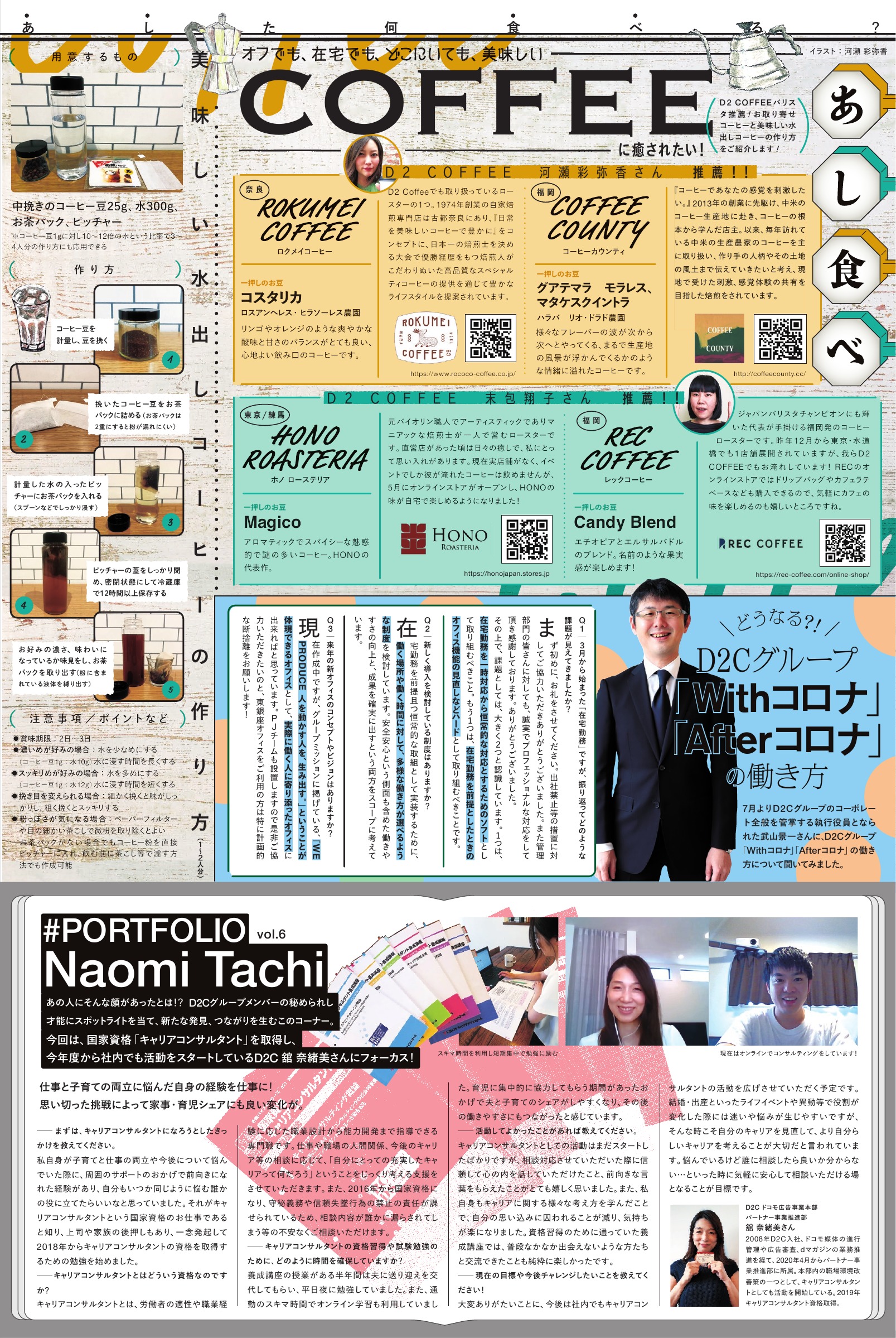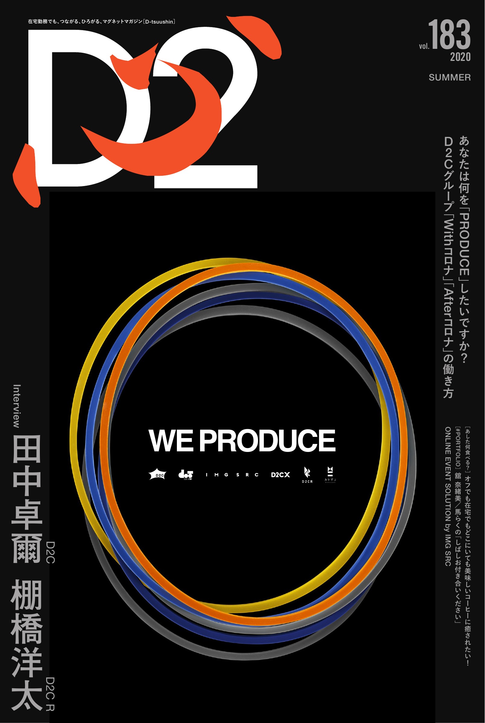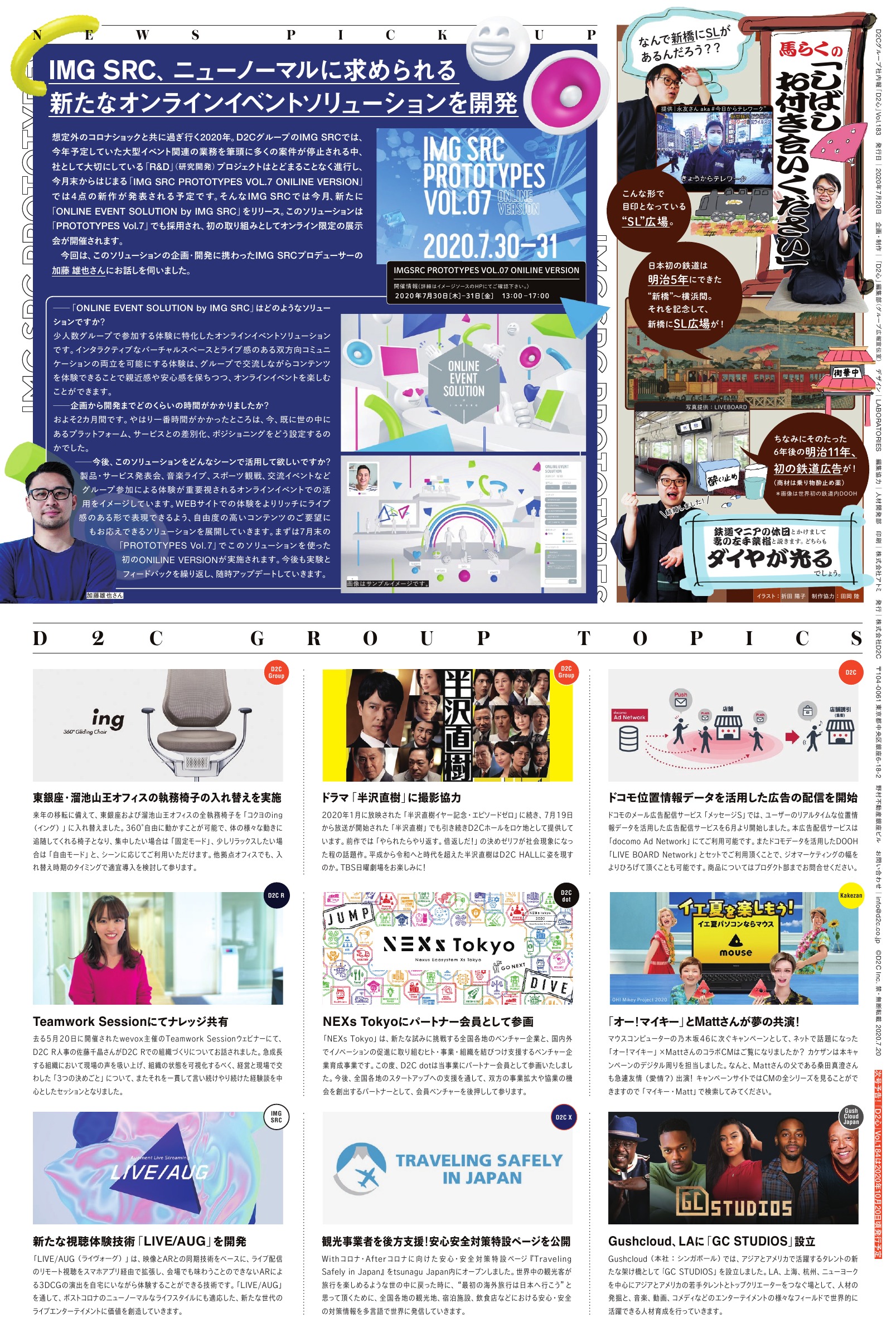 vol.183 2020 SUMMER 2020.07.20 発行 巻頭特集:D2C 田中 卓爾 棚橋 洋太 あなたは何を「PRODUCE」 したいですか D2Cグループ「Withコロナ」「Afterコロナ」の働き方 [あした何食べる?]オ フでも在宅でもどこにいても美味しいコーヒーに癒されたい! [#PORTFOLIO] 舘 奈緒美 / 馬らくの「しばしお付き合いください」 ONLINE EVENT SOLUTION by IMG SRC PDFで開く D2C GROUP TOPICS 東銀座・溜池山王オフィスの執務椅子の入れ替えを実施  ̄ ̄ ̄ ̄ ̄ ̄ ̄ ̄ ̄ ̄ ̄ ̄ ̄ ̄ ̄ ̄ ̄ ̄ ̄ 来年の移転に備えて、東銀座および溜池山王オフィスの全執務椅子を「コクヨのing(イング)」に入れ替えました。360°自由に動かすことが可能で、体の様々な動きに追随してくれる椅子となり、集中したい場合は「固定モード」、少しリラックスしたい場合は「自由モード」と、シーンに応じてご利用いただけます。他拠点オフィスでも、入れ替え時期のタイミングで適宜導入を検討して参ります。 ドラマ「半沢直樹」に撮影協力  ̄ ̄ ̄ ̄ ̄ ̄ ̄ ̄ ̄ ̄ ̄ ̄ ̄ ̄ ̄ ̄ ̄ ̄ ̄ 2020年1月に放映された「半沢直樹イヤー記念・エピソードゼロ」に続き、7月19日から放送が開始された「半沢直樹」でも引き続きD2Cホールをロケ地として提供しています。前作では「やられたらやり返す。倍返しだ!」の決めゼリフが社会現象になった程の話題作。平成から令和へと時代を超えた半沢直樹はD2C HALLに姿を現すのか。TBS日曜劇場をお楽しみに! ドコモ位置情報データを活用した広告の配信を開始  ̄ ̄ ̄ ̄ ̄ ̄ ̄ ̄ ̄ ̄ ̄ ̄ ̄ ̄ ̄ ̄ ̄ ̄ ̄ ドコモのメール広告配信サービス「メッセージS」では、ユーザーのリアルタイムな位置情報データを活用した広告配信サービスを6月より開始しました。本広告配信サービスは「docomo Ad Network」にてご利用可能です。またドコモデータを活用したDOOH「LIVE BOARD Network」とセットでご利用頂くことで、ジオマーケティングの幅をよりひろげて頂くことも可能です。商品についてはプロダクト部までお問合せください。 Teamwork Sessionにてナレッジ共有  ̄ ̄ ̄ ̄ ̄ ̄ ̄ ̄ ̄ ̄ ̄ ̄ ̄ ̄ ̄ ̄ ̄ ̄ ̄ 去る5月20日に開催されたwevox主催のTeamwork Sessionウェビナーにて、D2C R人事の佐藤千晶さんがD2C Rでの組織づくりについてお話されました。急成長する組織において現場の声を吸い上げ、組織の状態を可視化するべく、経営と現場で交わした「3つの決めごと」について、またそれを一貫して言い続けやり続けた経験談を中心としたセッションとなりました。 NEXs Tokyoにパートナー会員として参画  ̄ ̄ ̄ ̄ ̄ ̄ ̄ ̄ ̄ ̄ ̄ ̄ ̄ ̄ ̄ ̄ ̄ ̄ ̄ 「NEXs Tokyo」は、新たな試みに挑戦する全国各地のベンチャー企業と、国内外でイノベーションの促進に取り組むヒト・事業・組織を結びつけ支援するベンチャー企業育成事業です。この度、D2C dotは当事業にパートナー会員として参画いたしました。今後、全国各地のスタートアップへの支援を通して、双方の事業拡大や協業の機会を創出するパートナーとして、会員ベンチャーを後押しして参ります。 「オー!マイキー」とMattさんが夢の共演!  ̄ ̄ ̄ ̄ ̄ ̄ ̄ ̄ ̄ ̄ ̄ ̄ ̄ ̄ ̄ ̄ ̄ ̄ ̄ マウスコンピューターの乃木坂46に次ぐキャンペーンとして、ネットで話題になった「オー!マイキー」×MattさんのコラボCMはご覧になりましたか? カケザンは本キャンペーンのデジタル周りを担当しました。なんと、Mattさんの父である桑田真澄さんも急遽友情(愛情?)出演! キャンペーンサイトではCMの全シリーズを見ることができますので「マイキー・Matt」で検索してみてください。 新たな視聴体験技術「LIVE/AUG」を開発  ̄ ̄ ̄ ̄ ̄ ̄ ̄ ̄ ̄ ̄ ̄ ̄ ̄ ̄ ̄ ̄ ̄ ̄ ̄ 「LIVE/AUG(ライヴォーグ)」は、映像とARとの同期技術をベースに、ライブ配信のリモート視聴をスマホアプリ経由で拡張し、会場でも味わうことのできないARによる3DCGの演出を自宅にいながら体験することができる技術です。「LIVE/AUG」を通して、ポストコロナのニューノーマルなライフスタイルにも適応した、新たな世代のライブエンターテイメントに価値を創造していきます。 観光事業者を後方支援!安心安全対策特設ページを公開  ̄ ̄ ̄ ̄ ̄ ̄ ̄ ̄ ̄ ̄ ̄ ̄ ̄ ̄ ̄ ̄ ̄ ̄ ̄ Withコロナ・Afterコロナに向けた安心・安全対策特設ページ『Traveling Safely in Japan』をtsunagu Japan内にオープンしました。世界中の観光客が旅行を楽しめるような世の中に戻った時に、“最初の海外旅行は日本へ行こう”と思って頂くために、全国各地の観光地、宿泊施設、飲食店などにおける安心・安全の対策情報を多言語で世界に発信していきます。 Gushcloud、LAに「GC STUDIOS」設立  ̄ ̄ ̄ ̄ ̄ ̄ ̄ ̄ ̄ ̄ ̄ ̄ ̄ ̄ ̄ ̄ ̄ ̄ ̄ Gushcloud(本社:シンガポール)では、アジアとアメリカで活躍するタレントの新たな架け橋として「GC STUDIOS」を設立しました。LA、上海、杭州、ニューヨークを中心にアジアとアメリカの若手タレントとトップクリエーターをつなぐ場として、人材の発掘と、音楽、動画、コメディなどのエンターテイメントの様々なフィール