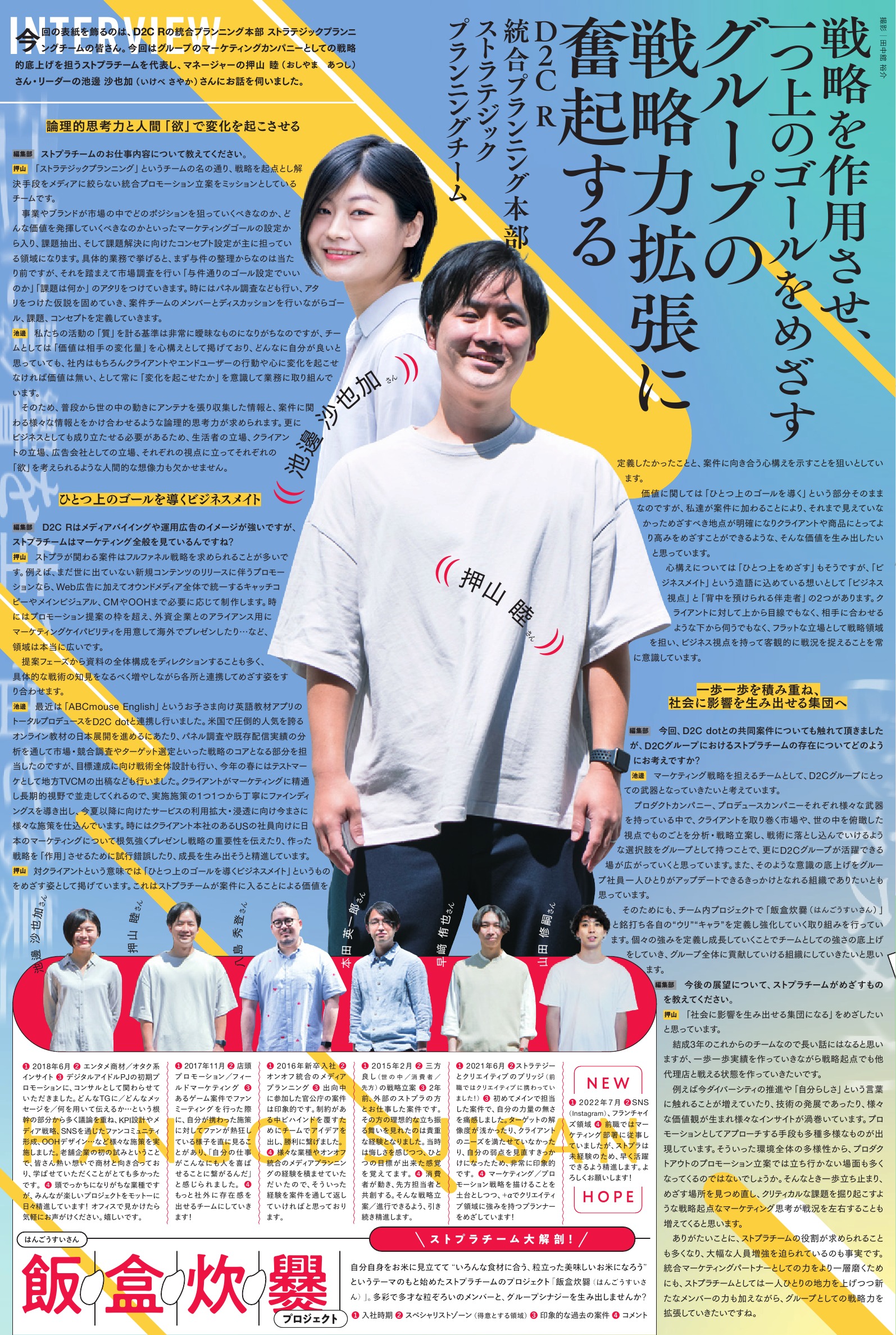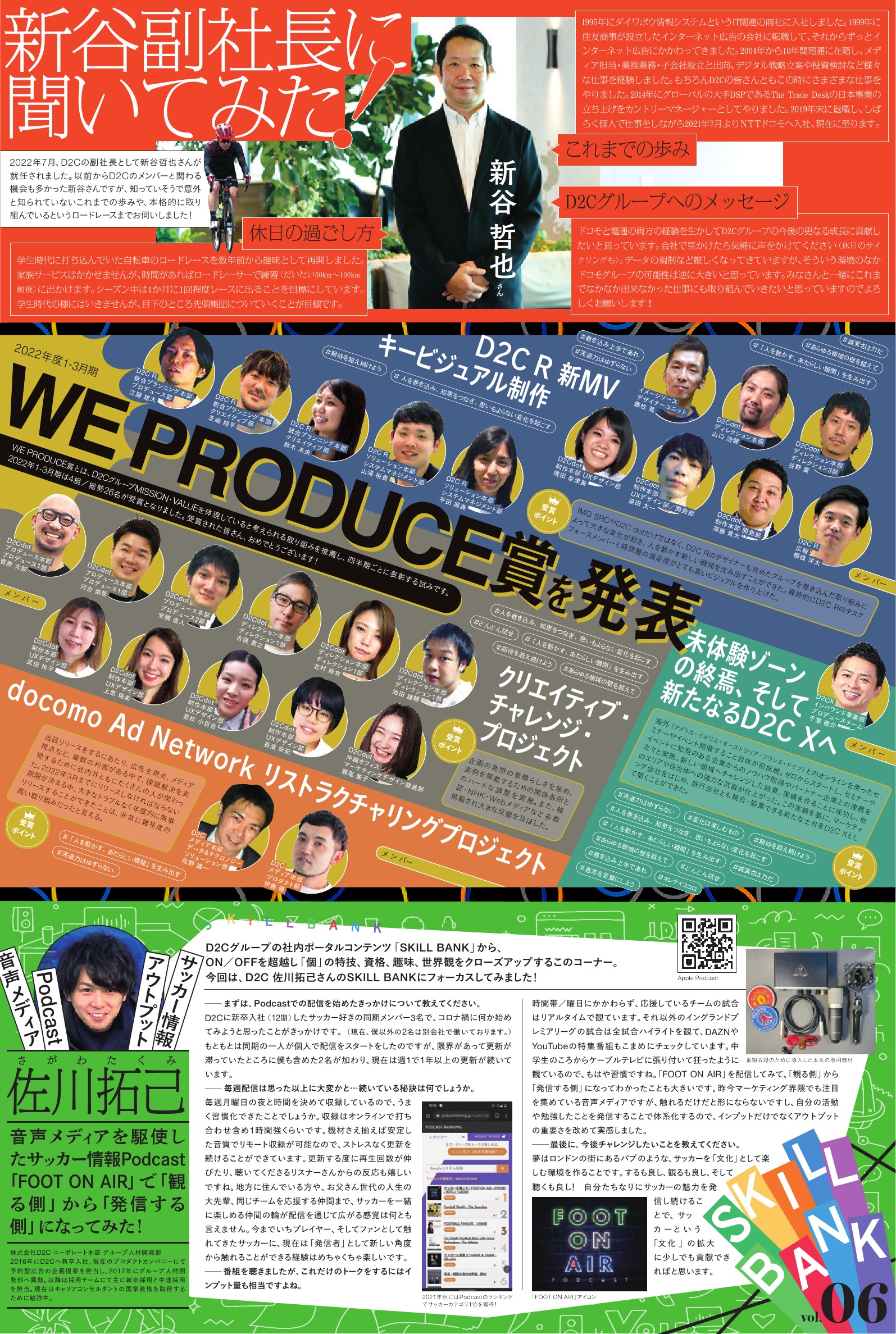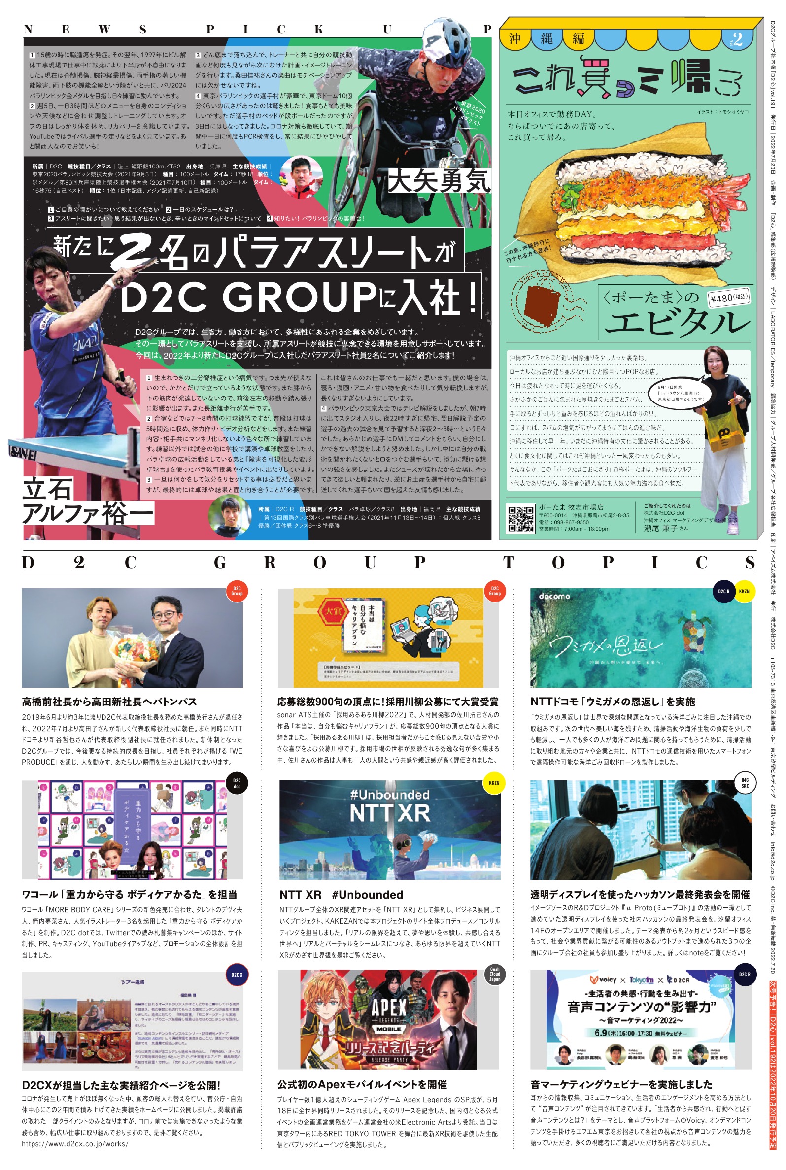 vol.191 2022 SUMMER 2022.07.20 発行 巻頭インタビュー:D2C R 統合プランニング本部 ストラテジックプランニングチーム 押山 睦・池邊 沙也加 [コラム] ストプラチーム大解剖!飯盒炊爨プロジェクト 新谷副社長に聞いてみた! 2022年度1-3月期「WE PRODUCE賞」発表 [SKILL BANK] D2C 佐川拓己 [これ買って帰ろ]〈ポーたま〉の「エビタル」 PDFで開く D2C GROUP TOPICS 高橋前社長から高田新社長へバトンパス  ̄ ̄ ̄ ̄ ̄ ̄ ̄ ̄ ̄ ̄ ̄ ̄ ̄ ̄ ̄ ̄ ̄ ̄ ̄ ̄ 2019年6月より約3年に渡りD2C代表取締役社長を務めた高橋英行さんが退任され、2022年7月より高田了さんが新しく代表取締役社長に就任。また同時にNTTドコモより新谷哲也さんが代表取締役副社長に就任されました。新体制となったD2Cグループでは、今後更なる持続的成長を目指し、社員それぞれが掲げる「WE PRODUCE」を通じ、人を動かす、あたらしい瞬間を生み出し続けてまいります。 応募総数900句の頂点に!採用川柳公募にて大賞受賞  ̄ ̄ ̄ ̄ ̄ ̄ ̄ ̄ ̄ ̄ ̄ ̄ ̄ ̄ ̄ ̄ ̄ ̄ ̄ ̄ sonar ATS主催の「採用あるある川柳2022」で、人材開発部の佐川拓己さんの作品「本当は、自分も悩むキャリアプラン」が、応募総数900句の頂点となる大賞に輝きました。「採用あるある川柳」は、採用担当者だからこそ感じる見えない苦労や小さな喜びをよむ公募川柳です。採用市場の世相が反映される秀逸な句が多く集まる中、佐川さんの作品は人事も一人の人間という共感や親近感が高く評価されました。 NTTドコモ「ウミガメの恩返し」を実施  ̄ ̄ ̄ ̄ ̄ ̄ ̄ ̄ ̄ ̄ ̄ ̄ ̄ ̄ ̄ ̄ ̄ ̄ ̄ ̄ 「ウミガメの恩返し」は世界で深刻な問題となっている海洋ごみに注目した沖縄での取組みです。次の世代へ美しい海を残すため、清掃活動や海洋生物の負荷を少しでも軽減し、 一人でも多くの人が海洋ごみ問題に関心を持ってもらうために、清掃活動に取り組む地元の方々や企業と共に、 NTTドコモの通信技術を用いたスマートフォンで遠隔操作可能な海洋ごみ回収ドローンを製作しました。 ウミガメの恩返し ワコール「重力から守る ボディケアかるた」を担当  ̄ ̄ ̄ ̄ ̄ ̄ ̄ ̄ ̄ ̄ ̄ ̄ ̄ ̄ ̄ ̄ ̄ ̄ ̄ ̄ ワコール「MORE BODY CARE」シリーズの新色発売に合わせ、タレントのデヴィ夫人、箭内夢菜さん、人気イラストレーター3名を起用した「重力から守る ボディケアかるた」を制作。D2C dotでは、Twitterでの読み札募集キャンペーンのほか、サイト制作、PR、キャスティング、YouTubeタイアップなど、プロモーションの全体設計を担当しました。 重力から守る ボディケアかるた NTT XR #Unbounded  ̄ ̄ ̄ ̄ ̄ ̄ ̄ ̄ ̄ ̄ ̄ ̄ ̄ ̄ ̄ ̄ ̄ ̄ ̄ ̄ NTTグループ全体のXR関連アセットを「NTT XR」として集約し、ビジネス展開していくプロジェクト。KAKEZANでは本プロジェクトのサイト全体プロデュース/コンサルティングを担当しました。「リアルの限界を超えて、夢や思いを体験し、共感し合える世界へ」リアルとバーチャルをシームレスにつなぎ、あらゆる限界を超えていくNTT XRがめざす世界観を是非ご覧ください。 NTT XR 透明ディスプレイを使ったハッカソン最終発表会を開催  ̄ ̄ ̄ ̄ ̄ ̄ ̄ ̄ ̄ ̄ ̄ ̄ ̄ ̄ ̄ ̄ ̄ ̄ ̄ ̄ イメージソースのR&Dプロジェクト『μ Proto(ミュープロト)』の活動の一環として進めていた透明ディスプレイを使った社内ハッカソンの最終発表会を、汐留オフィス14Fのオープンエリアで開催しました。テーマ発表から約2ヶ月というスピード感をもって、社会や業界貢献に繋がる可能性のあるアウトプットまで進められた3つの企画、グループ会社の社員も参加し盛り上がりました。詳しくはnoteをご覧ください! 「μProto」社内ハッカソン最終発表会レポート D2CXが担当した主な実績紹介ページを公開!  ̄ ̄ ̄ ̄ ̄ ̄ ̄ ̄ ̄ ̄ ̄ ̄ ̄ ̄ ̄ ̄ ̄ ̄ ̄ ̄ D2CXが担当した主な実績紹介ページを公開!コロナが発生して売上がほぼ無くなった中、顧客の総入れ替えを行い、官公庁・自治体中心にこの2年間で積み上げてきた実績をホームページに公開しました。掲載許諾の取れた一部クライアントのみとなりますが、コロナ前では実施できなかったような業務も含め、幅広い仕事に取り組んでおりますので、是非ご覧ください。 インバウンドマーケティング実績紹介 公式初のApexモバイルイベントを開催  ̄ ̄ ̄ ̄ ̄ ̄ ̄ ̄ ̄ ̄ ̄ ̄ ̄ ̄ ̄ ̄ ̄ ̄ ̄ ̄ プレイヤー数1億人超えのシューティングゲーム Apex Legends のSP版が、5月18日に全世界同時リリースされました。そのリリースを記念した、国内初となる公式イベントの企画運営業務をゲーム運営会社の米Electronic Artsより受託。当日は東京タワー内にあるRED TOKYO TOWER を舞台に最新XR技術を駆使した生配信とパブリックビューイングを実施しました。 Apex Legends Mobile ∼リリース記念パーティ∼ 音マーケティングウェビナーを実施しました  ̄ ̄ ̄ ̄ ̄ ̄ ̄ ̄ ̄ ̄ ̄ ̄ ̄ ̄ ̄ ̄ ̄ ̄ ̄ ̄ 耳からの情報収集、コミュニケーション、生活者のエンゲージメントを高める方法として”音声コンテンツ“が注目されてきています
