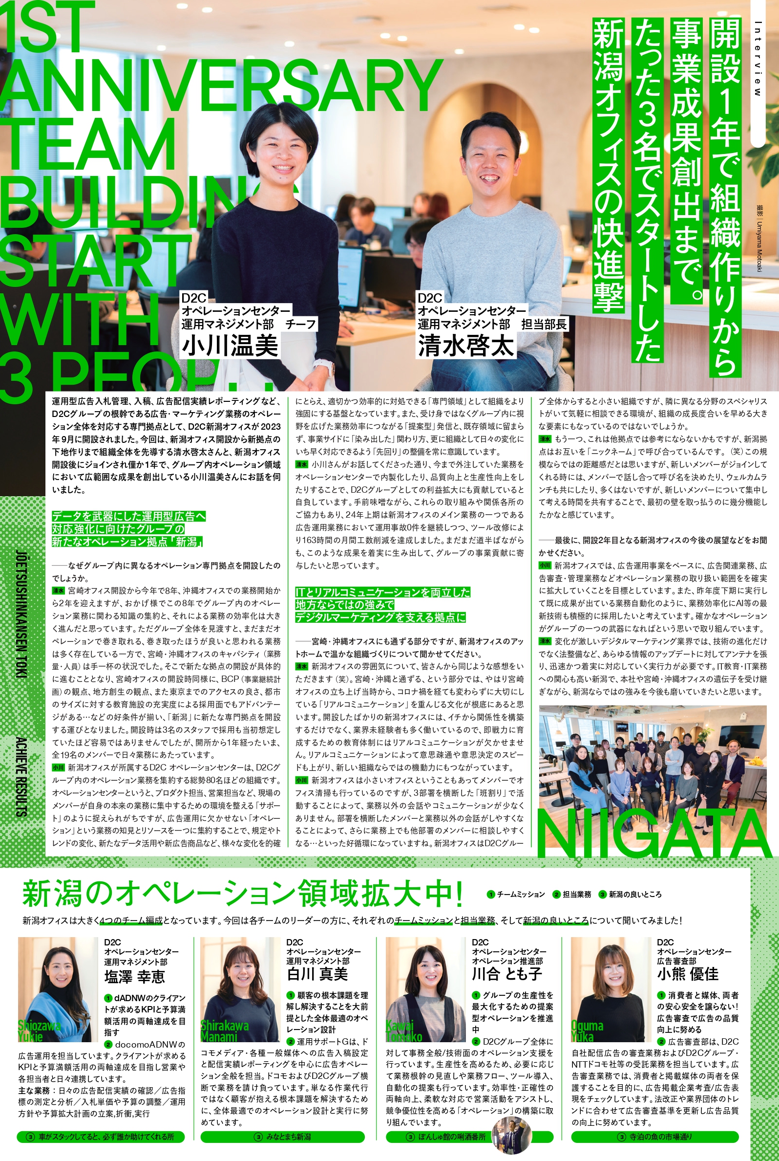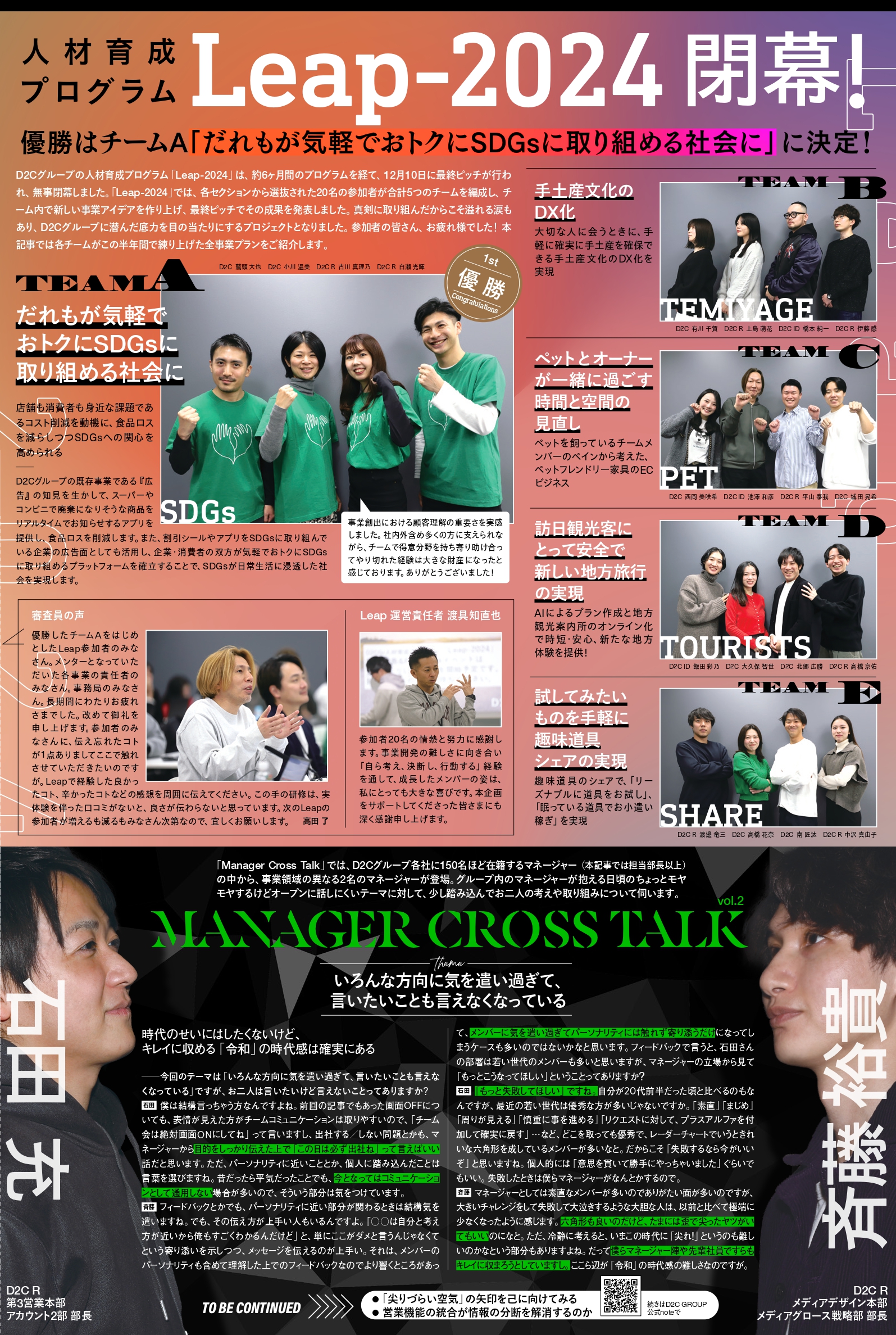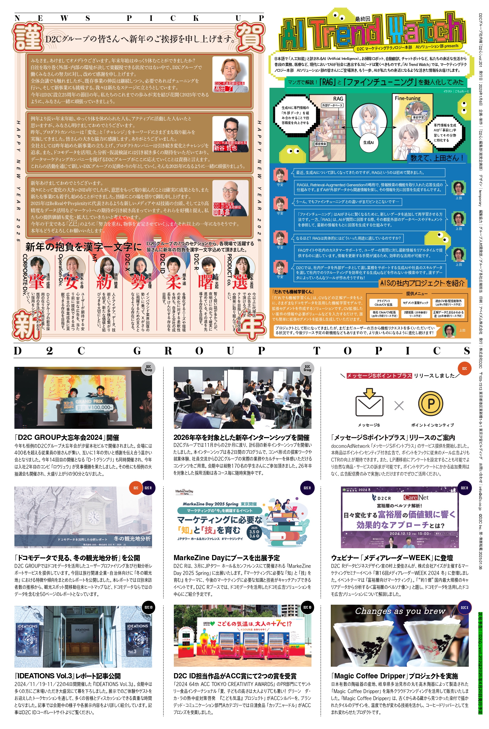 vol.201 2025 WINTER 2025.01.06 発行 巻頭インタビュー:開設1年で組織作りから事業成果創出まで。たった3名でスタートした新潟オフィスの快進撃 人材育成プログラムLeap-2024閉幕! Manager Cross Talk 石田 充×斉藤 裕貴 謹賀新年 D2Cグループの皆さんへ新年のご挨拶を申し上げます AI Trend Watch D2C GROUP TOPICS PDFで開く D2C GROUP TOPICS 「D2C GROUP大忘年会2024」開催 今年も恒例のD2Cグループ大忘年会が汐留本社ビルで開催されました。会場には400名を超える従業員の皆さんが集い、互いに1年の労いと感謝を伝え合う温かい会となりました。今年14回目の開催となる「D-1グランプリ」も同時開催され、今年は入社2年目のコンビ「ロウリュウ」が見事優勝を果たしました。その他にも恒例の大抽選会も開催され、大盛り上がりの90分となりました。 2026年卒を対象とした新卒インターンシップを開催 D2Cグループでは11月からの2か月に渡り、計6回の新卒インターンシップを開催いたしました。本インターンシップは各2日間のプログラムで、コンペ形式の提案ワークや就業体験、社員交流からD2Cグループの実際の業務やカルチャーを体感いただけるコンテンツをご用意。会期中は総勢170名の学生さんにご参加頂きました。26年卒を対象とした採用活動は各コース毎に随時実施中です。 「メッセージSポイントプラス」リリースのご案内 docomoAdNetwork「メッセージSポイントプラス」のサービス提供を開始しました。本商品はポイントインセンティブ付き広告で、ポイントをフックに従来のメール広告よりもCTRの向上が期待できます。また、LP遷移前にアンケートを設定することも可能でより自然な商品・サービスの訴求が可能です。ポイントやアンケートにかかる追加費用はなく、広告配信費のみで実施いただけますのでぜひご活用ください。 「ドコモデータで見る、冬の観光地分析」を公開 D2C GROUPではドコモデータを活用したユーザープロファイリング及び行動分析レポートサービスを提供しています。今回は旅行関連企業・自治体向けに「冬の観光地」における特徴や傾向をまとめたレポートを公開しました。本レポートでは日別来訪者数の推移から、観光スポット間移動往来ヒートマップなど、ドコモデータならではのデータを含む全50ページのレポートとなっています。 MarkeZine Dayにブースを出展予定 D2C Rは、3月にJPタワー ホール&カンファレンスにて開催される「MarkeZineDay 2025 Spring」に出展いたします。『マーケティングに必要な「知」と「技」を育む』をテーマに、今後のマーケティングに必要な知識と技術がキャッチアップできるイベントです。D2C Rブースでは、ドコモデータを活用したドコモ広告ソリューションを中心にご紹介予定です。 ウェビナー「メディアレーダーWEEK」 に登壇 D2C Rデータビジネスデザイン室の村上愛佳さんが、株式会社アイズが主催するマーケティングセミナーイベント「第16回メディアレーダーWEEK 2024 冬」に登壇しました。イベントテーマは「富裕層向けマーケティング」。「“約1億”国内最大規模のキャリアデータから分析する<富裕層のペルソナ像>」と題し、ドコモデータを活用したドコモ広告ソリューションについて解説しました。 『IDEATIONS Vol.3』レポート記事公開 2024/11/19-11/22の4日間開催した『IDEATIONS Vol.3』。会期中は多くの方にご来場いただき大盛況にて幕を下ろしました。展示でのご体験やゲストをお迎えしたトークセッションを通して、多くの皆様とディスカッションできる貴重な時間となりました。記事では会期中の様子や各展示内容をより詳しく紹介しています。記事はD2C IDコーポレートサイトよりご覧ください。 開発から顧客体験までを提案、先端テックのプロトタイプ展「IDEATIONS」レポート ACC賞にてACCシルバーとACCブロンズを受賞 「2024 64th ACC TOKYO CREATIVITY AWARDS」のPR部門にてサントリー食品インターナショナル「夏、子どもの高さは大人より7℃も暑い! グリーン ダ・カ・ラの熱中症対策啓発 『こども気温』プロジェクト」がACCシルバーを、ブランデッド・コミュニケーション部門Aカテゴリーでは日清食品「カップニャードル」がACCブロンズを受賞しました。 ニュース 「2024 64th ACC TOKYO CREATIVITY AWARDS」にて2つの賞を受賞 「Magic Coffee Dripper」プロジェクトを実施 日本有数の陶磁器の産地、岐阜県多治見市の丸モ高木陶器によって製造された「Magic Coffee Dripper」を海外クラウドファンディングを活用して販売いたしました。「Magic Coffee Dripper」は、古くからある蔵から見つかった染付で描かれたタイルのデザインを、温度で色が変わる技術を活かし、コーヒードリッパーとして生まれ変わらせたプロダクトです。 前へ 次へ SHARE note Facebook