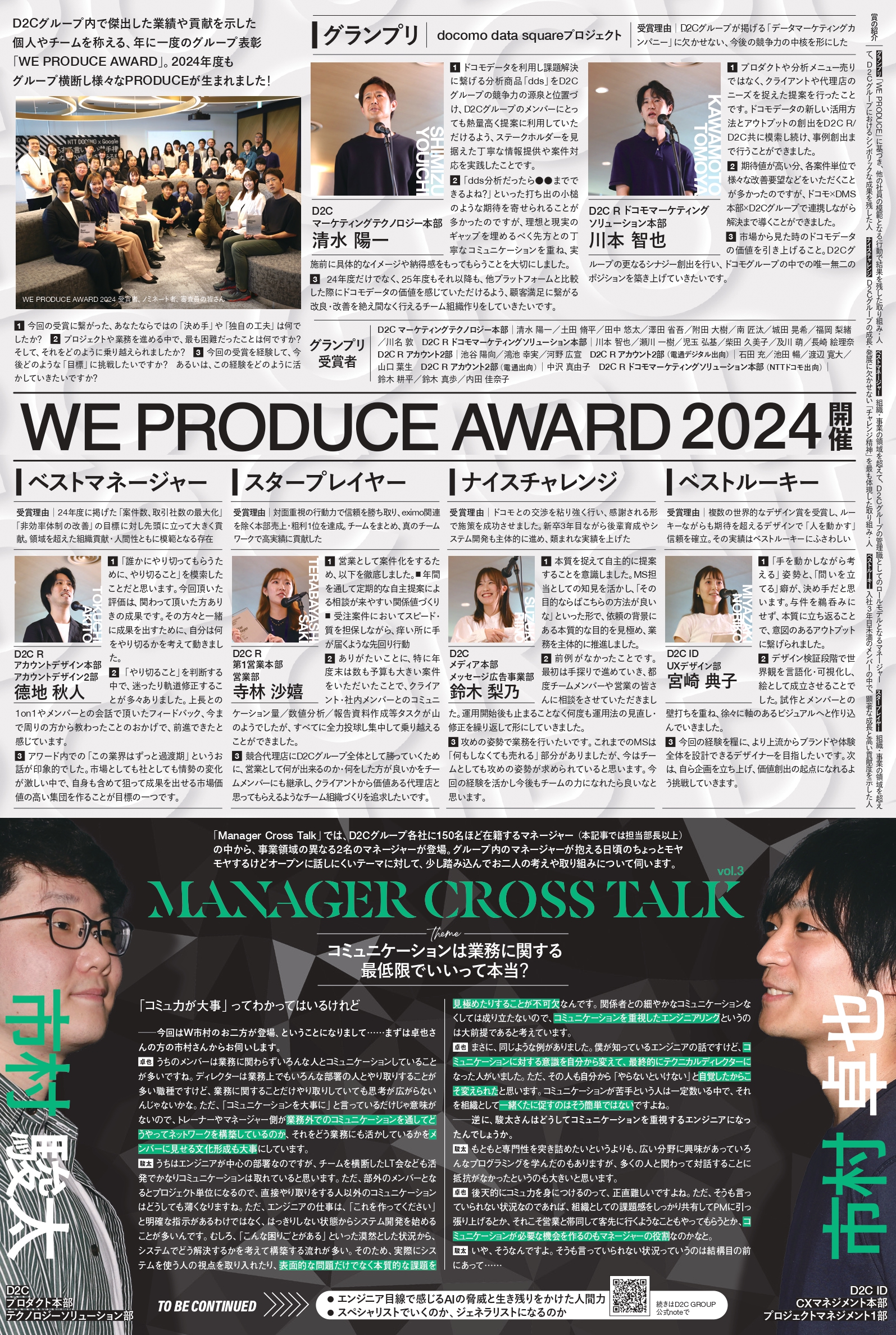 清野 僕の場合は「主要広告プラットフォームも扱っている割には小回りが利く」ことでしょうか。主要広告プラットフォームの運用はインハウスへ切り替えが進むクライアントも多い一方で、ニッチなメディアを細かくプランニングして運用するのはノウハウが集約しきれず内製化が難しい側面もあります。かといって、大手広告代理店ではなかなか請けてくれない。そうなると、僕らのような機動力が強みとなるんです。機動力に加えて、ドコモメディアを専門に扱ってきたキャリアレップとしての実績と信頼、他キャリア・その他ニッチな広告メニューも扱える代理店としての機能もある。実際に、2024年度はキャリアメニューを軸としたニッチなメディアの取り扱いがきっかけで案件を拡大することができました。手が出しにくいニッチな広告メニューを横断的に取り扱いさせていただけるのも、キャリアレップとしてスタートしたD2Cグループが25年培ってきた信頼を土台に、新しい分野にも手を広げながらそれぞれ事業として確立してきた実績があるからこそなので、そこはどんなに機動力があっても新興企業には追随できない部分だと自信を持っています。