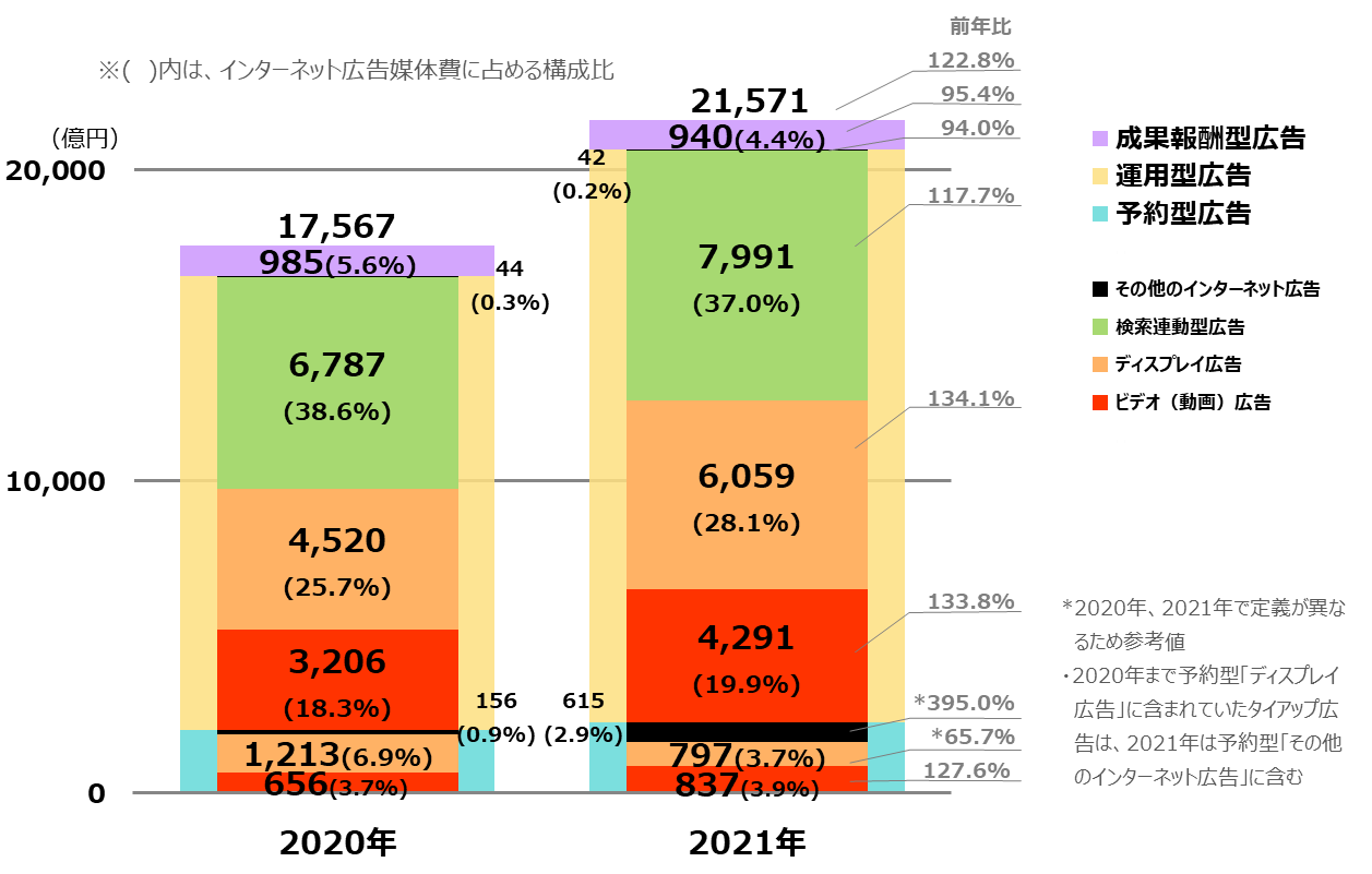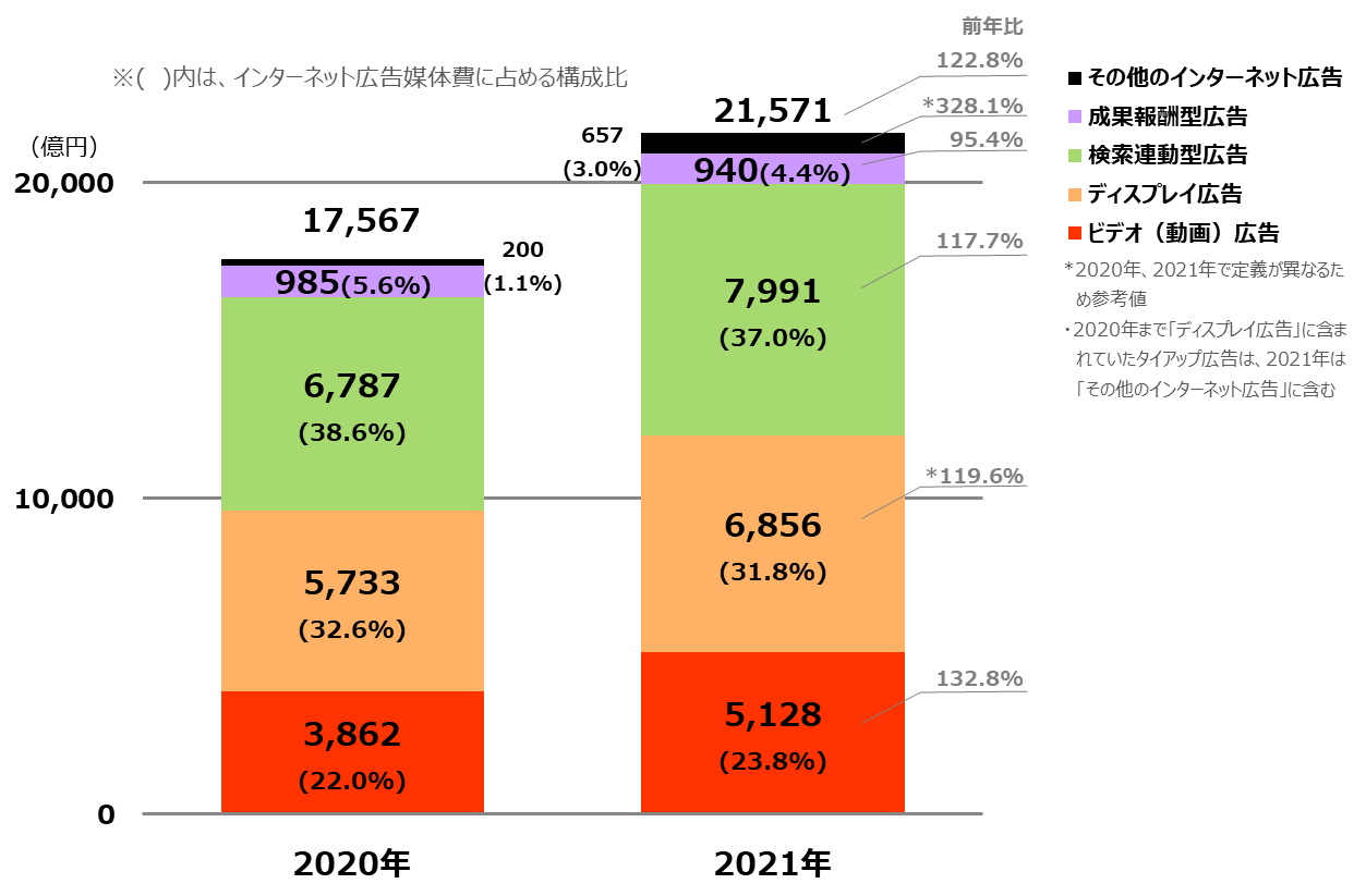 2021年のインターネット広告媒体費は、2兆 1,571 億円(電通「2021年 日本の広告費」より)。そのうち構成比が高いのは検索連動型広告(37.0%)とディスプレイ広告(31.8%)で、あわせて約7割を占める。ビデオ(動画)広告は前年比132.8%の5,128億円と大きく伸長し、初めて5,000億円を突破した。なお、2020年までディスプレイ広告に含まれていたタイアップ広告を、2021年ではその他のインターネット広告に含むことに定義変更した。2021年のタイアップ広告はおよそ300~350億円規模と推計。【グラフ1】
