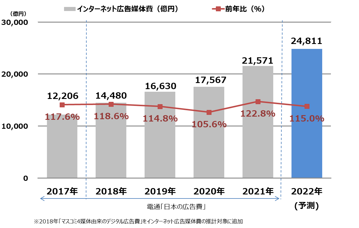 ~2022年のインターネット広告媒体費は総額で2兆4,811億円(前年比115.0%)になると予測~