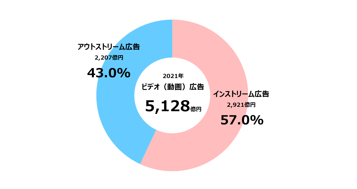 ビデオ(動画)広告費5,128億円のうち動画コンテンツの間に挿入されるインストリーム広告は2,921億円(構成比57.0%)で、ウェブ上の広告枠や記事のコンテンツ面等で表示されるアウトストリーム広告は2,207億円(構成比43.0%)となった。【グラフ4】