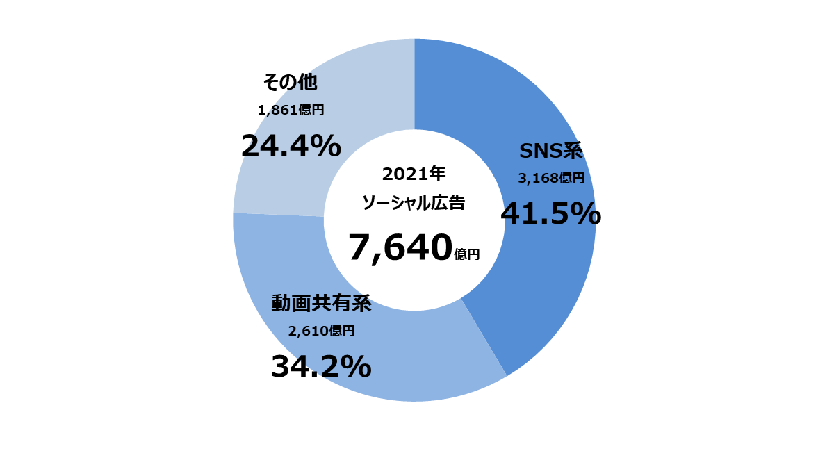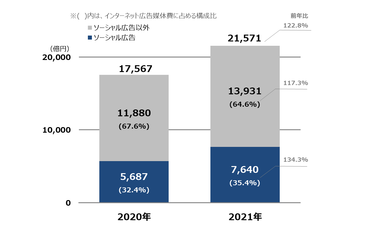 SNSや動画共有プラットフォーム上等で展開されるソーシャル広告は前年比134.3%の7,640億円となり、インターネット広告媒体費全体の35.4%となった。