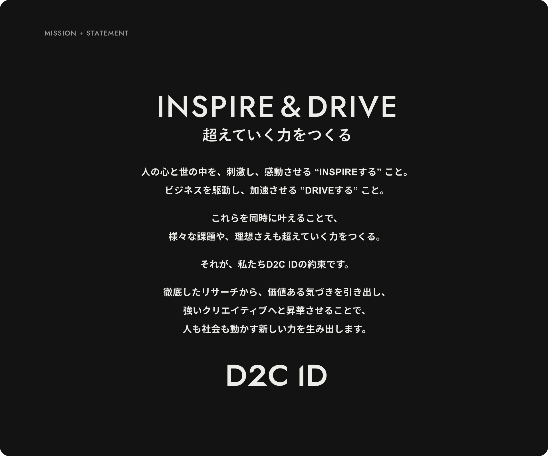 D2C IDの新たなミッション「INSPIRE & DRIVE 超えていく力をつくる」には、今まで両社が提供してきた制作領域だけでなく、企業やブランド、サービスの様々な課題に対して、徹底したリサーチをもとにしたマーケティングとクリエイティブで、人も社会も動かす顧客体験を提供していく、という意志が込められています。また、その想いは新社名にも由来します。