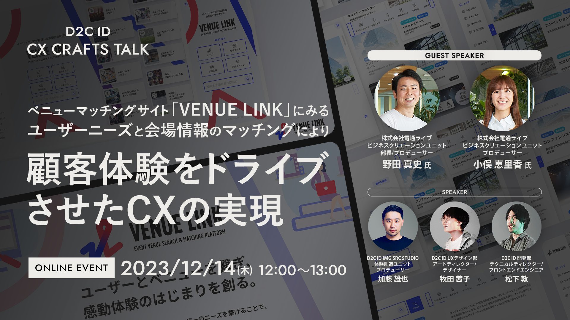 今回のウェビナーでは、2023年7月にリリースされた会場情報検索サービス「VENUE LINK(ベニューリンク)」の事例をもとに、同サービスを立ち上げた株式会社電通ライブ(以下、電通ライブ)の野田 真史 氏と小俣 恵里香 氏をゲストにお招きし、「CX(顧客体験)視点でのサービス開発と体験設計」をテーマにしたトークセッションをお届けします。