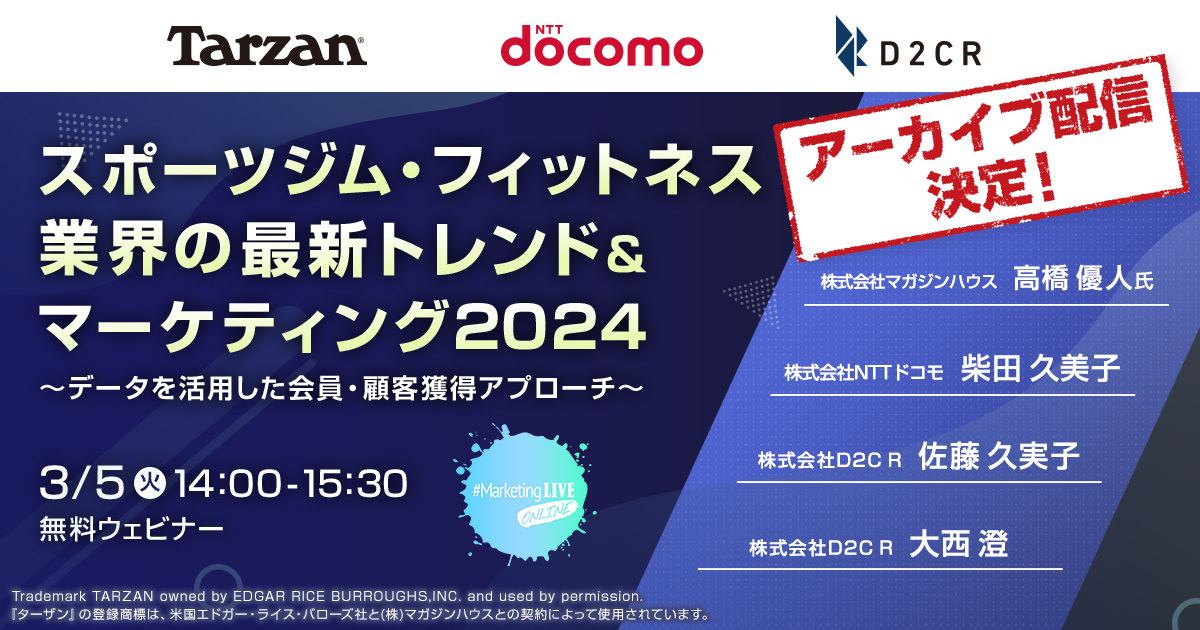 株式会社D2C R(本社:東京都港区、代表取締役社長:豊永 雅史、以下D2C R)では去る3月5日(火)、スポーツジム・フィットネス業界の最新トレンドとマーケティングについて、ドコモデータを活用した顧客獲得アプローチについて考える無料ウェビナーを開催いたしました。(共催:株式会社NTTドコモ(以下、ドコモ)/株式会社マガジンハウス・雑誌「Tarzan」)