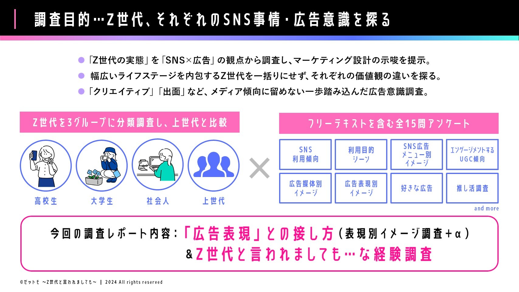 そこでゼットモでは、Z世代を「高校生/大学生/社会人」に分類し「上世代」と【SNS×広告】をテーマに価値観を比較するアンケート調査を実施しました。