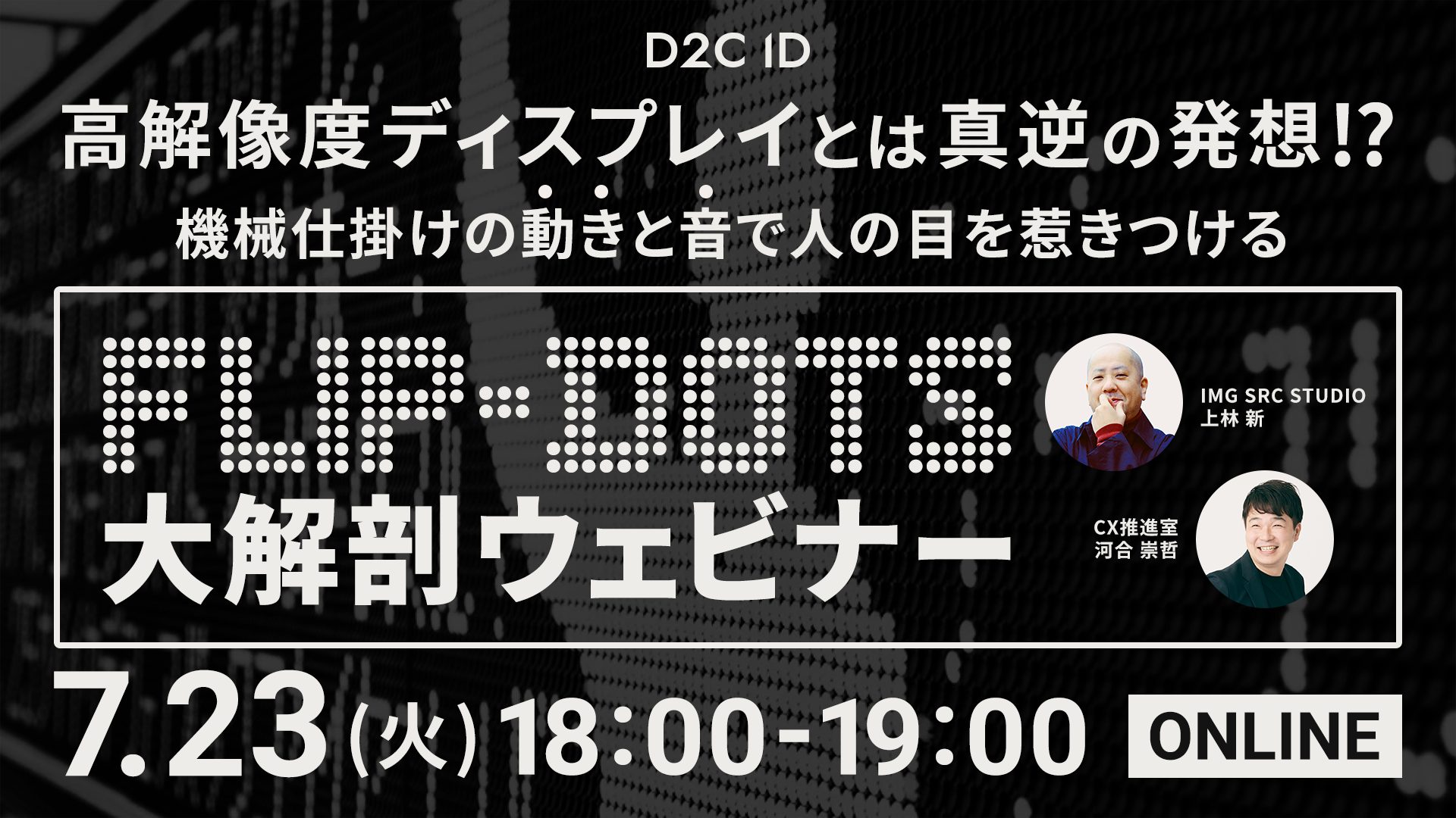株式会社D2C ID(本社:東京都港区、代表取締役:岡 勇基、以下D2C ID)は、高解像度ディスプレイとは真逆の発想からリアルな顧客体験をつくりだす手法として、機械仕掛けの動きと音で人の目を惹きつける『FLIP-DOTS(フリップドッツ)』の魅力をご紹介する無料ウェビナーを、2024年7月23日(火)に開催いたします。