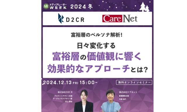 株式会社D2C R(本社:東京都港区、代表取締役社長:豊永 雅史、以下D2C R)は、株式会社アイズ(本社:東京都渋谷区、代表取締役社長:福島 範幸、以下アイズ)が主催する「第16回メディアレーダーWEEK 2024 冬」の無料オンラインセミナーに、当社アカウントデザイン本部の村上 愛佳が登壇することをお知らせいたします。