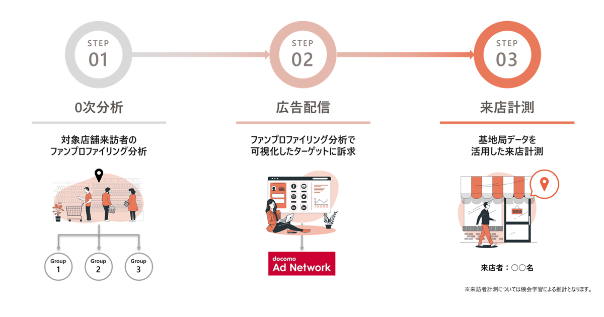 今回提供を開始した「来店計測パッケージ」では、ドコモが保有する基地局情報を活用し、ユーザー同意のもと、対象エリアや該当店舗へ来訪しているユーザーを捕捉することで、分析から広告配信、来店計測まで一気通貫で実施することが可能です。本サービスでは、お客さま(※1)からの事前同意を得たデータを個人が特定できないかたちで利用いたします。また、本サービスにおいては、プライバシーに配慮したセキュアな環境で分析を実施するほか、本サービスにより得られる分析結果はあくまで統計情報に限られ、分析結果から個人を識別することはできません。