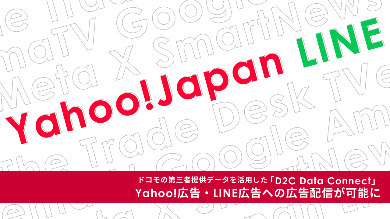 株式会社D2C(本社:東京都港区、代表取締役社長:高田 了、以下D2C)と、株式会社D2C R(本社:東京都港区、代表取締役社長:豊永 雅史、以下D2C R)は、株式会社NTTドコモ(以下ドコモ)から提供を受けている第三者提供に同意されたユーザーデータ(以下ドコモデータ※1、広告識別子・属性情報・位置情報・行動履歴など)を活用し外部プラットフォームへ配信可能な広告ソリューション「D2C Data Connect」の配信メディアを拡大しました。今回は新たにYahoo!広告・LINE広告で、ドコモデータを活用した高精度かつ幅広いターゲティングが可能になりました。