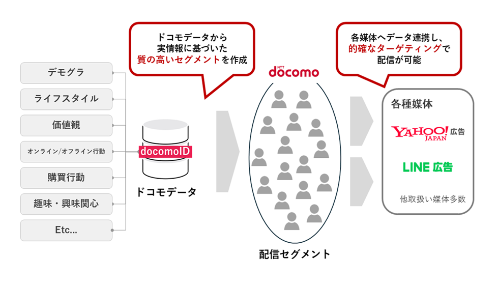 ドコモから第三者提供を受けたドコモデータを活用し大手外部プラットフォームへ配信可能な広告ソリューションです。Google、Meta、X、SmartNews、Yahoo!Japan、LINE等、さまざまな媒体にスムーズに連携が可能です。契約者単位でのデモグラ/決済/娯楽傾向までの正確性の高いドコモデータを、ターゲットに合わせてセグメント化、ターゲティング配信を行うことで、最適なチャネルでリーチできる環境をご提供致します。