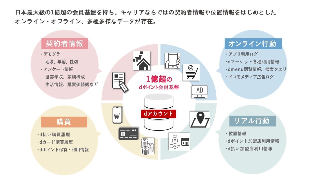 D2Cが、ドコモから提供を受けている第三者提供に同意されたユーザーデータ(広告識別子・属性情報・位置情報・行動履歴など)。1億超(2024年12月末時点のdポイントクラブ会員)の会員基盤を持ち、属性データ(性別、年齢など)だけでなくキャリアならではの位置情報・購買履歴などの実行動データを保有しています。
