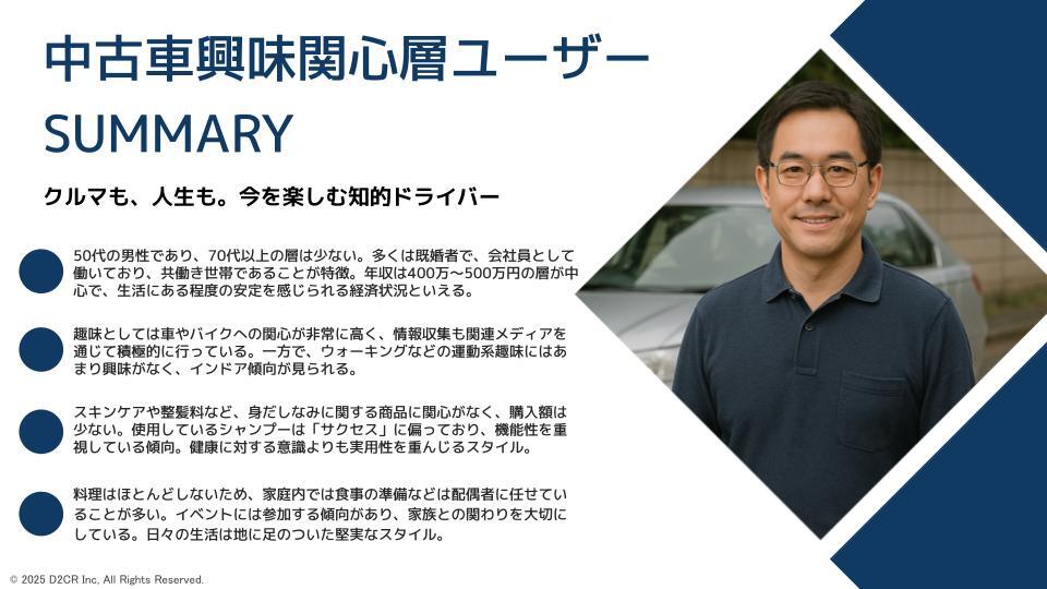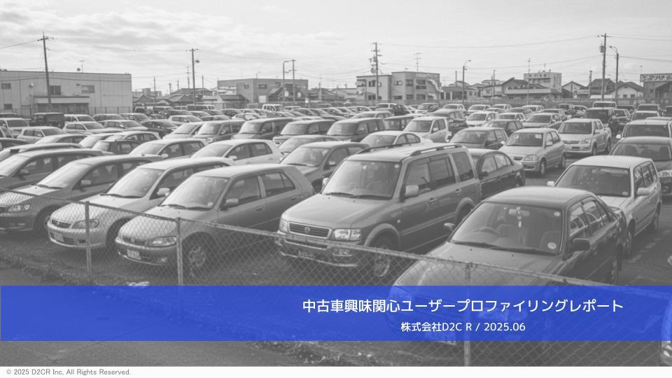 株式会社D2C R(本社:東京都港区、代表取締役社長:豊永 雅史、以下D2C R)は、株式会社NTTドコモ(本社:東京都千代田区、代表取締役社長:前田 義晃、以下ドコモ)が保有する1億超(※1)の会員基盤をベースにしたドコモデータ(※2)を活用したユーザープロファイル分析レポートの第13弾として、「中古自動車」にフォーカスを当てた「中古車興味関心層ユーザープロファイリングレポート」を公開いたしました。