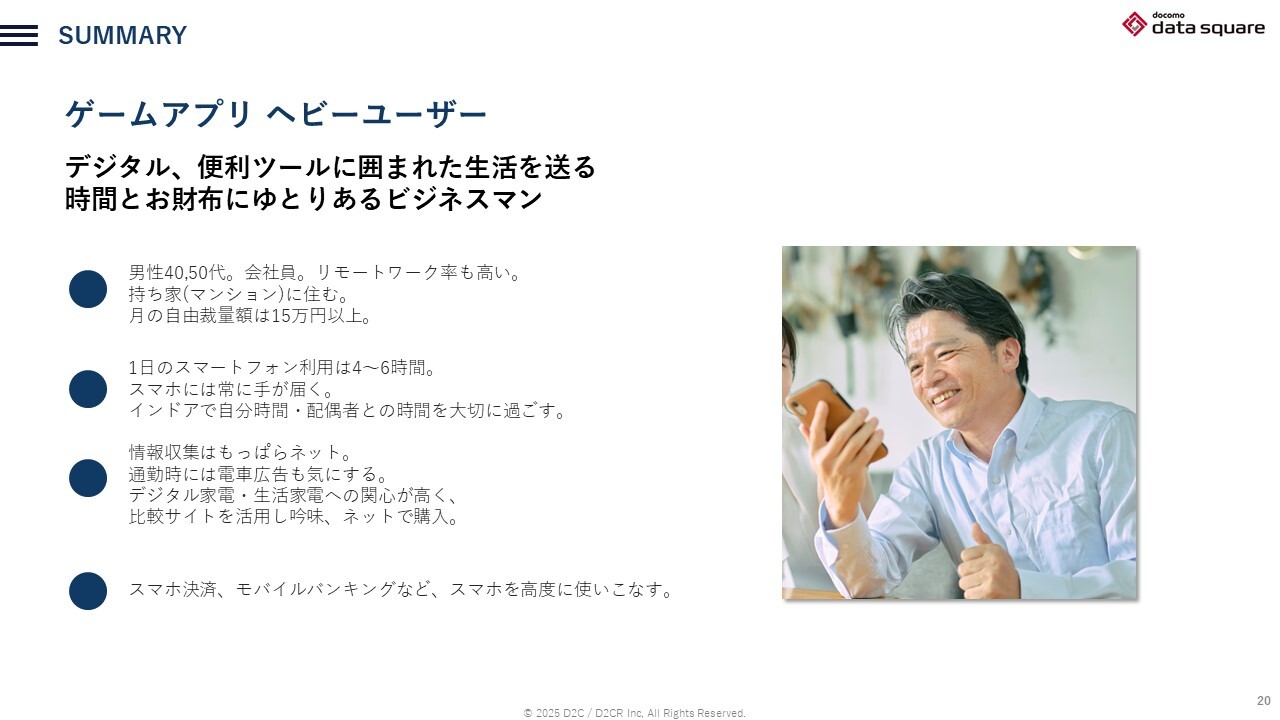 目的 :ドコモユーザーにおけるゲームアプリユーザーの特徴把握