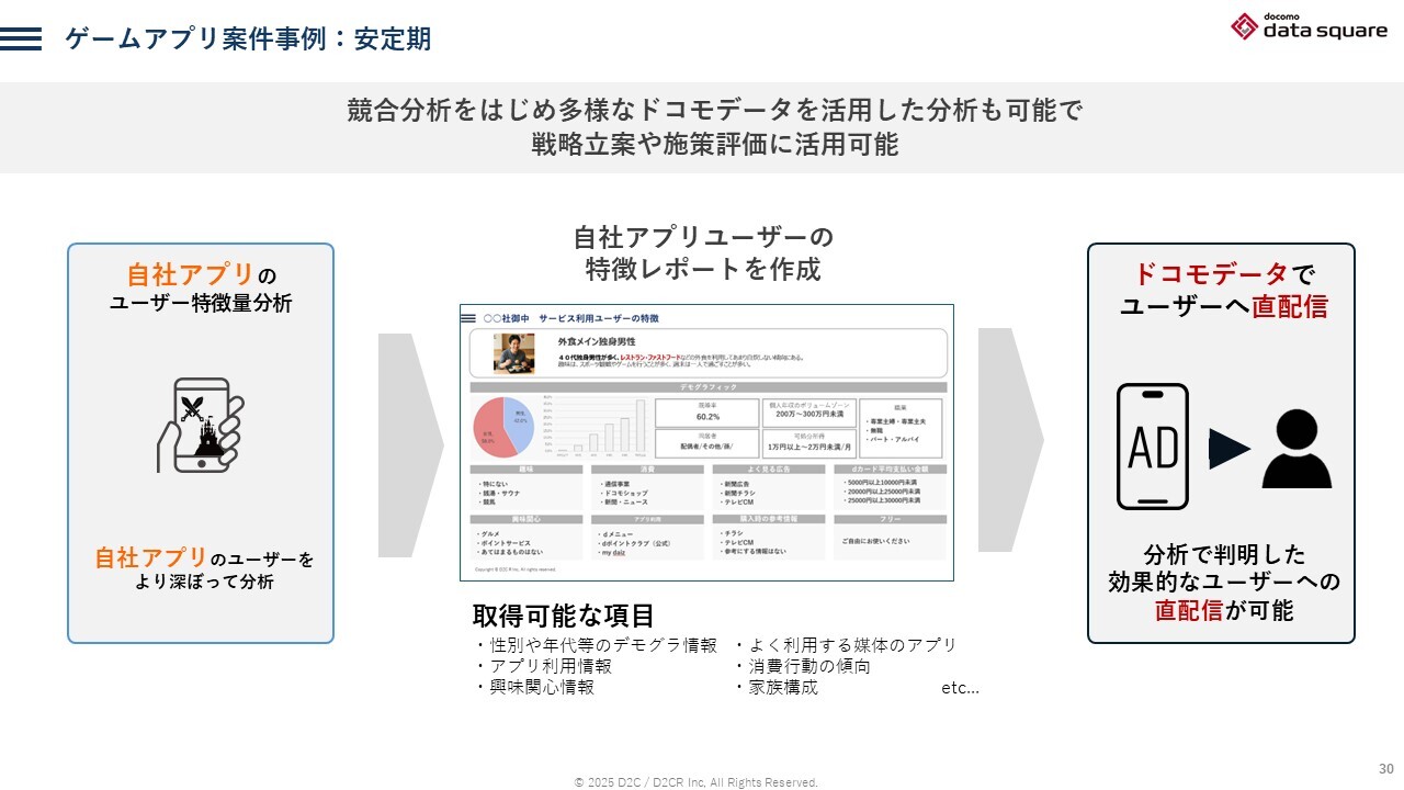 このような市場環境の変化を受け、ドコモデータを活用した精緻なユーザープロファイリングにより、ゲームアプリ関連事業の発展に貢献すべく本レポートを企画・公開しました。