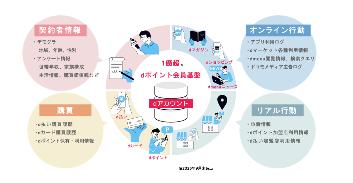 株式会社D2Cが、ドコモから提供を受けている第三者提供に同意されたユーザーデータ(広告識別子・属性情報・位置情報・行動履歴など)。1億超(2025年9月末時点のdポイントクラブ会員)の会員基盤を持ち、属性データ(性別、年齢など)だけでなくキャリアならではの位置情報・購買履歴などの実行動データを保有しています。