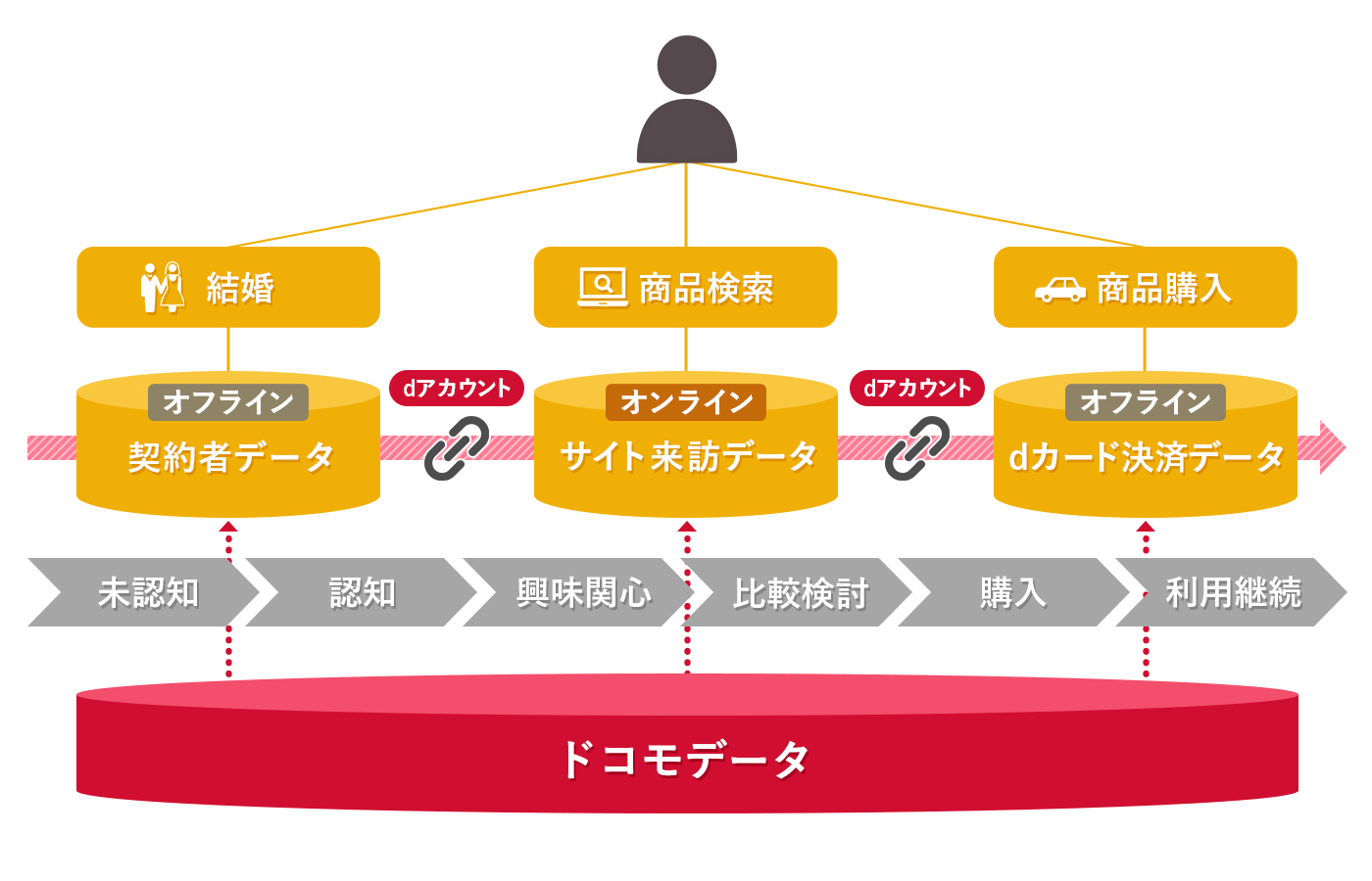 「docomo data squareジャーニー分析」では、このデータ分断の課題を解決するべく、ドコモが保有する1億超のdアカウントに紐づく多様なドコモデータを活用します。性別、年齢などの属性データに加え、キャリアならではの位置情報や購買履歴といった実行動に基づくデータを一つのIDで管理できるため、対象ユーザーのオンライン・オフラインを問わない中長期的な行動を、一つのジャーニーとして可視化することができます。