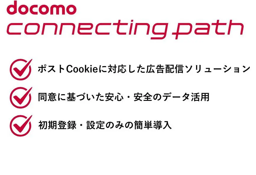 「docomo connecting path(略称:コネパス)」とは、お客さまからの事前同意のもと、ドコモが発行するIPアドレス等を用いてユーザー識別を可能にするプライバシーに配慮した広告専用ID発行ソリューションです。