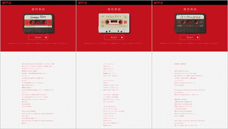 世界中で議論を巻き起こしたソーシャルチェーン・ミステリー「13の理由」。ある女子高生の同調圧力による自殺。非常に難しいテーマを描く作品を3組のアーティストが視聴。その想いをつづった歌をドラマのモチーフであるカセットテープに吹き込み、映像・OOH・WEB・渋谷での街頭サンプリングと横断的なキャンペーンを展開しました。