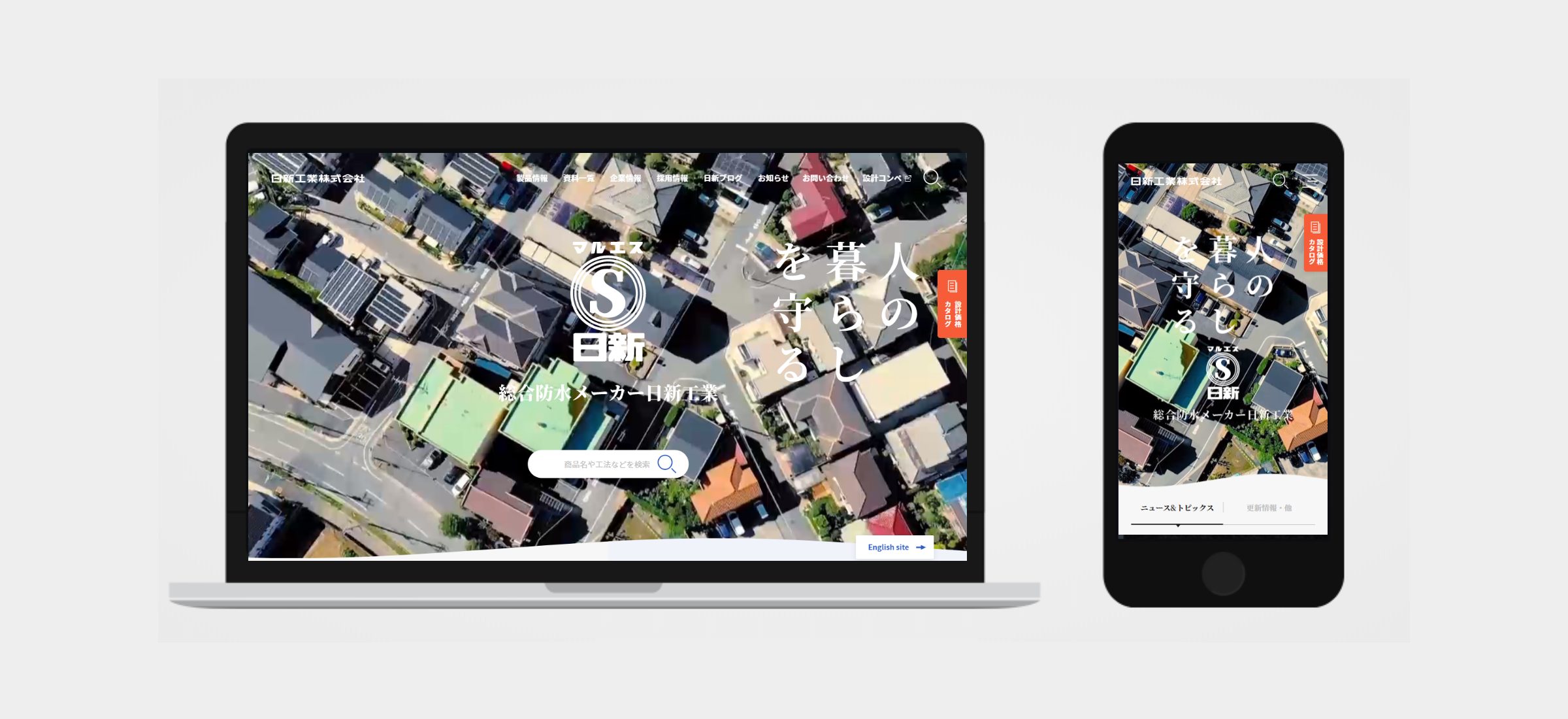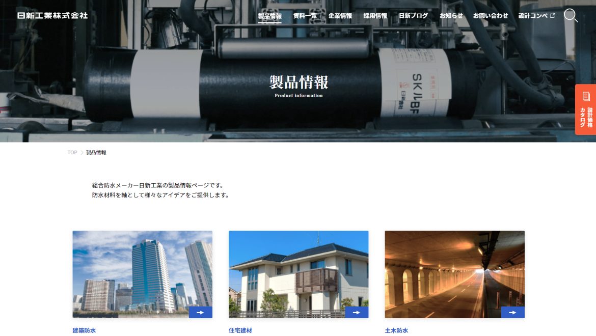 2022年で100周年を迎える建築物の屋上やバルコニーを雨水の浸入から守る総合防水メーカー日新工業株式会社のコーポレートサイト。 防水業界において、誰もが知る防水総合メーカーを目指すことをテーマに、D2C dotでは、サイトリニューアルをプロデュースしました。 リニューアルサイトでは、 「水の守り神”日新工業”」 をメッセージに、100年の歴史がある格式高い企業である信頼と安心の訴求と、一方で堅すぎるブランドイメージの払拭を目指しました。 デザインでは、わかりやすいUIと、現代風なデザインのバランスを意識し、日新工業らしい実直さを感じるデザイン設計をおこないました。