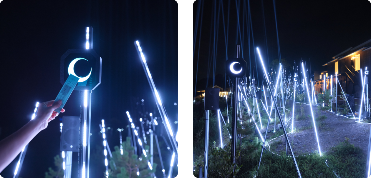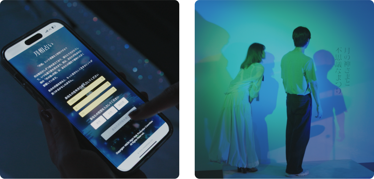 本イベントでは、最初に体験者がスマートフォンから「月占い」を実施します。生年月日と性別を入れると生まれた日の月相色がわかり、その色に合わせたイルミネーションチケットを購入いただけます。各エリア内には月型のサインがあり、イルミネーションチケットをかざすと、体験者の月相色に合わせて変化します。